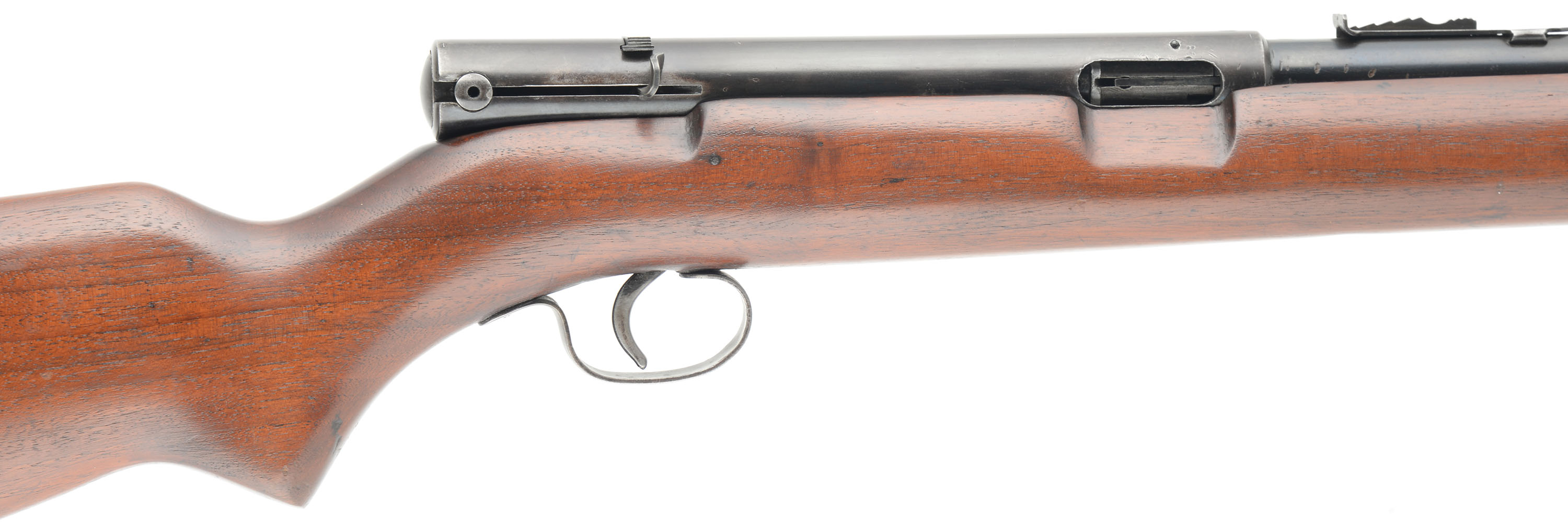 Winchester, Model 74, Marked .22 SHORT, MFG. 1946, SN: 143868, Semi-Auto Rifle, 22'' Tapered round barrel, The original American straight grain walnut & pistol grip stock is very good & solid. The stock has several minor scrapes & contusions to the original finish, with an added thin layer of finish. The is a 1'' tightly repaired crack at the forend tip. The original metal blue finish rates 60% on the barrel, while the receiver has 40% coverage of finish toning to a brown patina. Bore is excellent. Fitted with an adjustable rear sight & small blade front sight. The unusual receiver mounted safety functions by sliding it side to side within a dovetail channel. FFL or C&R Req - Value: 200 to 400