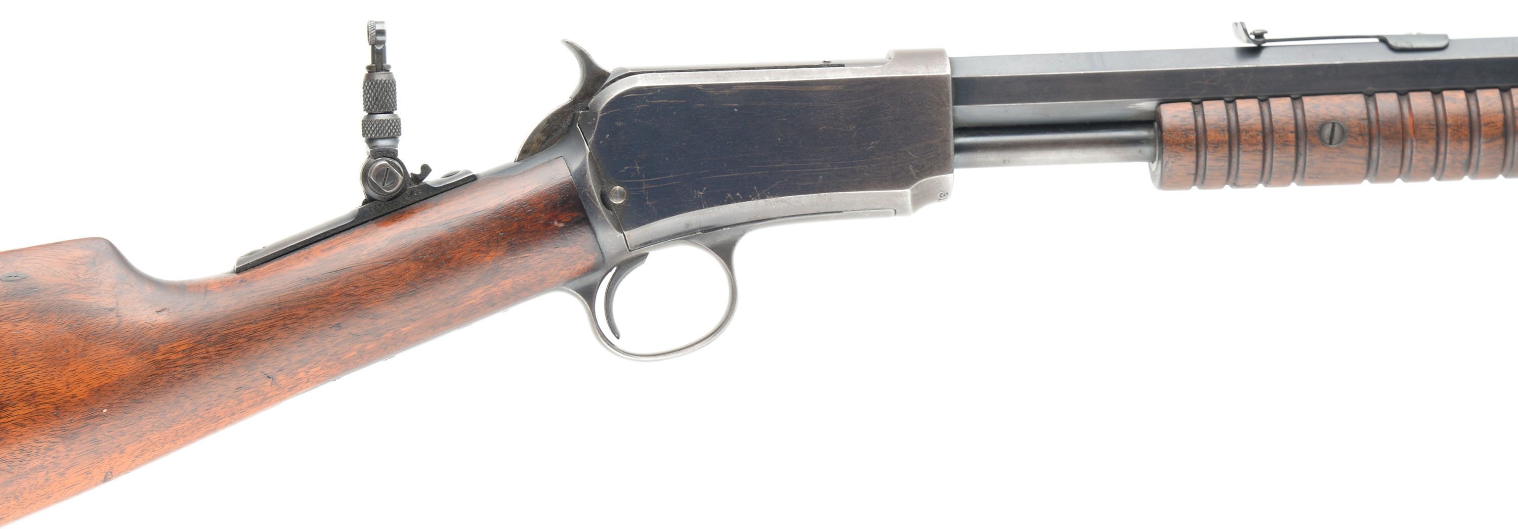 Winchester, Model 1890 2nd variation, .22 WRF Cal., MFG. 1907, SN: 319639, Pump Action Rifle, 24'' Octagonal barrel, The original wood stocks are excellent, with several tiny to minor scratches, scrapes & contusions to the original finish. There is also some added oils to the original finish. There is a small ''8W'' stamped on the belly of the stock below the lower tang, unknown reason. The original metal blue finish is 85% on the barrel, 60% on the receiver & mag tube. Bore is good & bright, but with cleaned pitting & scarring amongst solid rifling. Fitted with an upgraded sight package of a Marbles flip-up tang sight, adjustable rear & folding globe front sight. Crescent metal buttplate. Tight action. A collectible & original condition 1890 in the desirable WRF caliber. FFL or C&R Req. - Value: 1500 to 2000