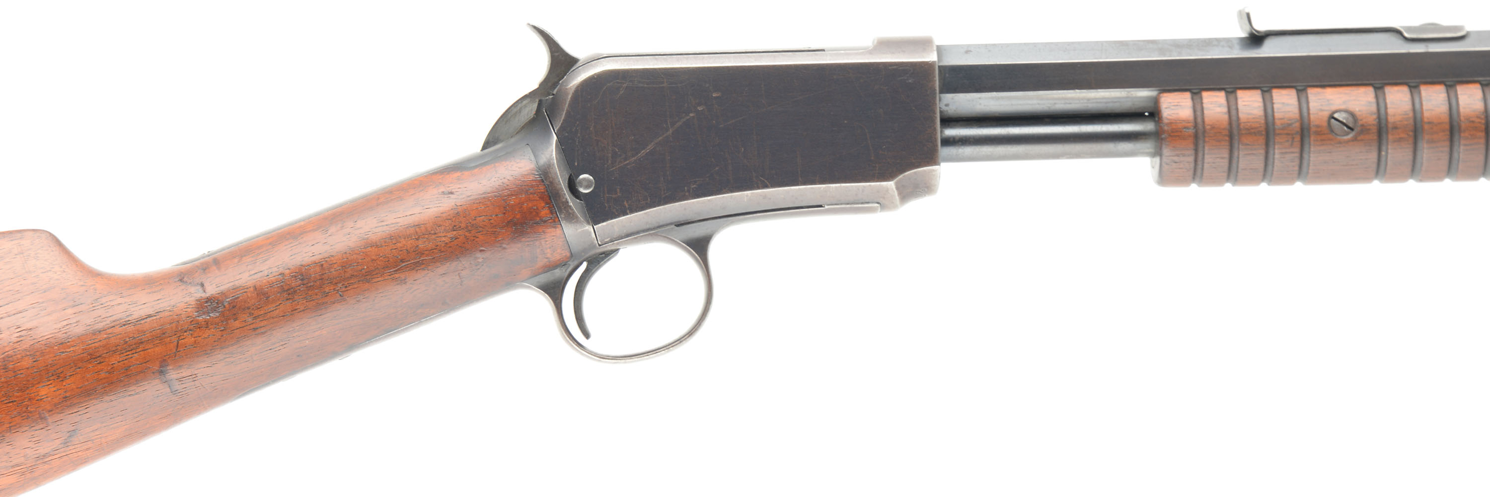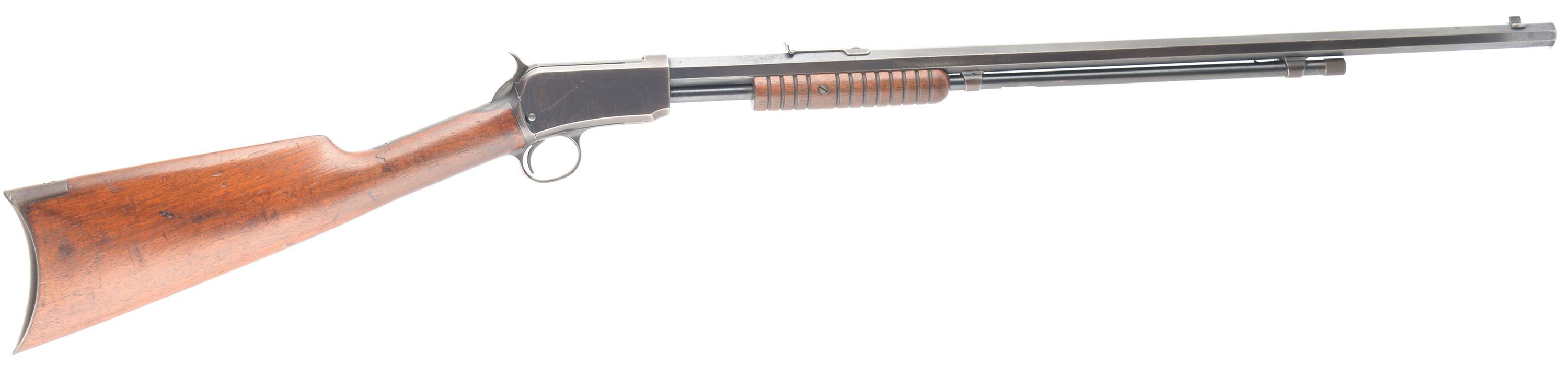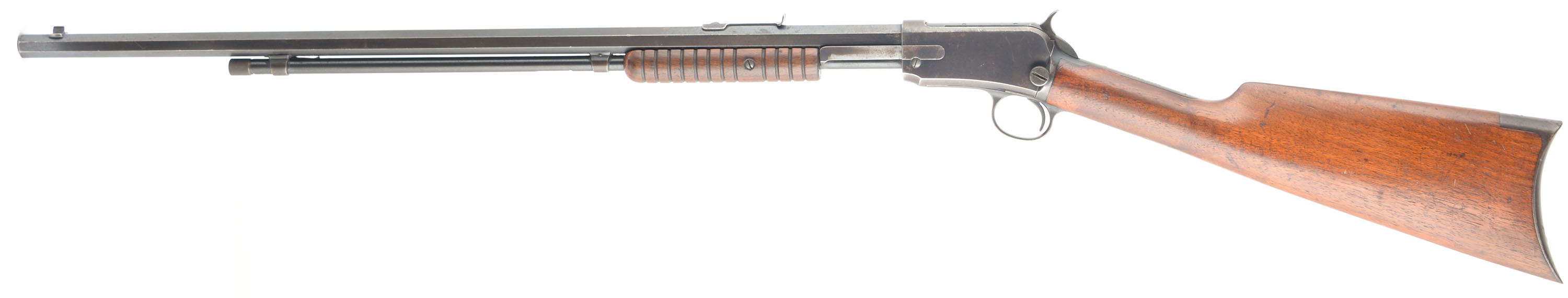 Winchester, Model 1890 2nd variation, .22 SHORT Cal., MFG. 1906, SN: 274210, Pump Action Rifle, 24'' Octagonal barrel. Single Caliber rifle. The original straight grip wood stocks are excellent, with several minor scuffs, scratches & contusions to the original thinning finish. The original blue finish rates 70% overall, with areas of thinning toning to a plum/brown patina. There is an area of speckling in front of the rear sight on barrel. The barrel carries an adjustable rear & a blade front sight. The bore is very good. Crescent metal buttplate. Tight smooth action. An all original, very nice & desirable single short caliber 1890. FFL or C&R Req. - Value: 1250 to 1750
