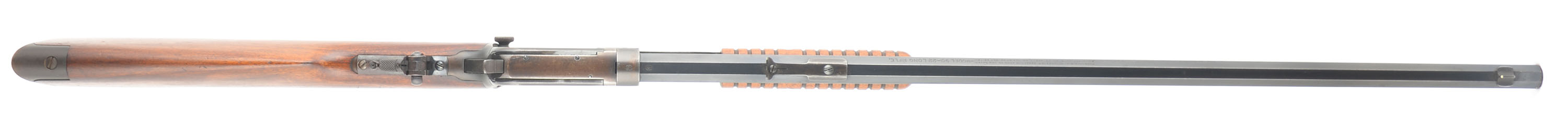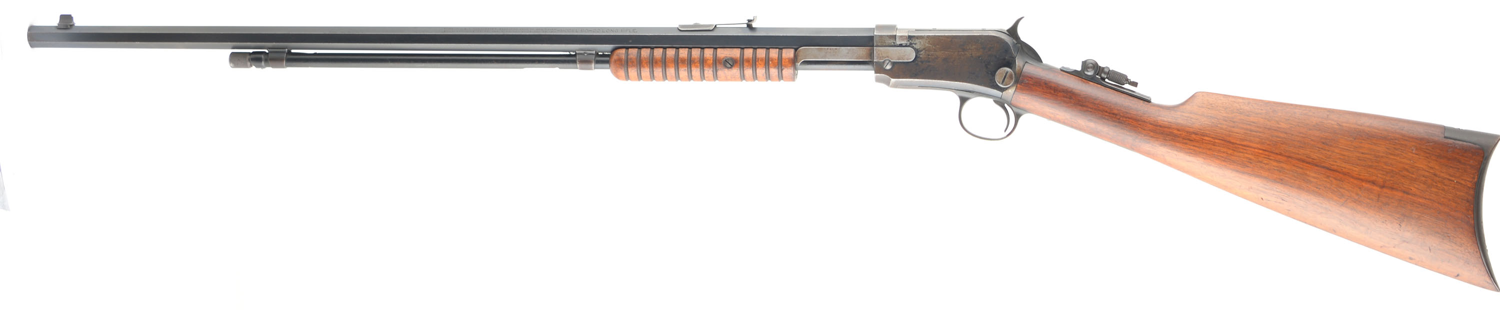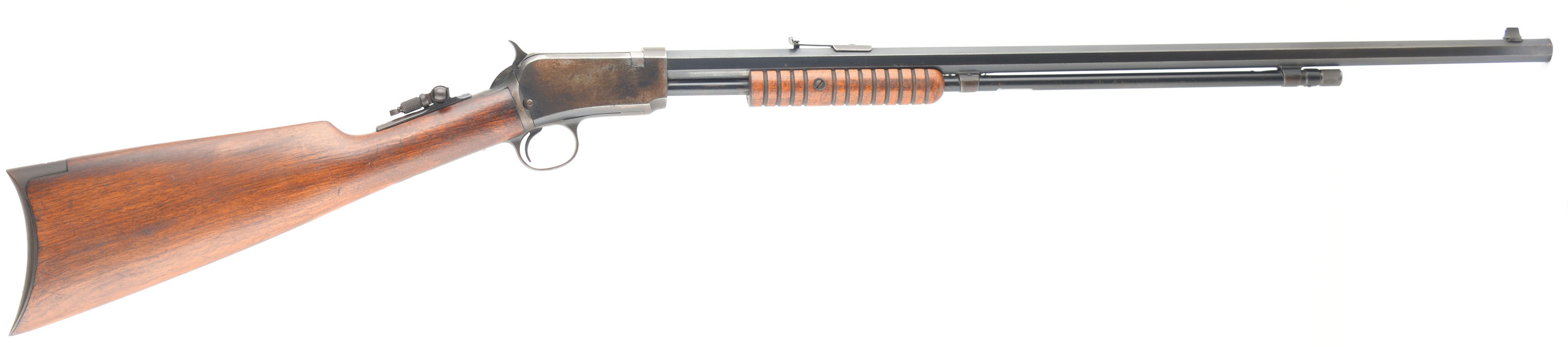 Winchester, Model 90, .22 LONG RIFLE Cal., MFG: 1932 SN: 844619, Slide Action Pump, 24'' Tapered octagon barrel. The L.R, only caliber is the rarest & most desired caliber amongst collectors as only 10% of total production was this caliber. The L.R. caliber was added in the 1890 line-up in 1919. The original wood is excellent, with a few minor finish level handling marks to the original finish. The original metal blued finish rates 85% on the barrel & mag, while the receiver has a thin brown patina & remnants of blue in the more protected areas. Bore is excellent. The receiver carries a Lyman flip-up tang sight, while the barrel carries the original adjustable rear sight & blade front sight, with white bead. Factory crescent steel buttplate, A very nice original example of a single caliber 90. FFL or C&R Req. - Value: 1500 to 2500