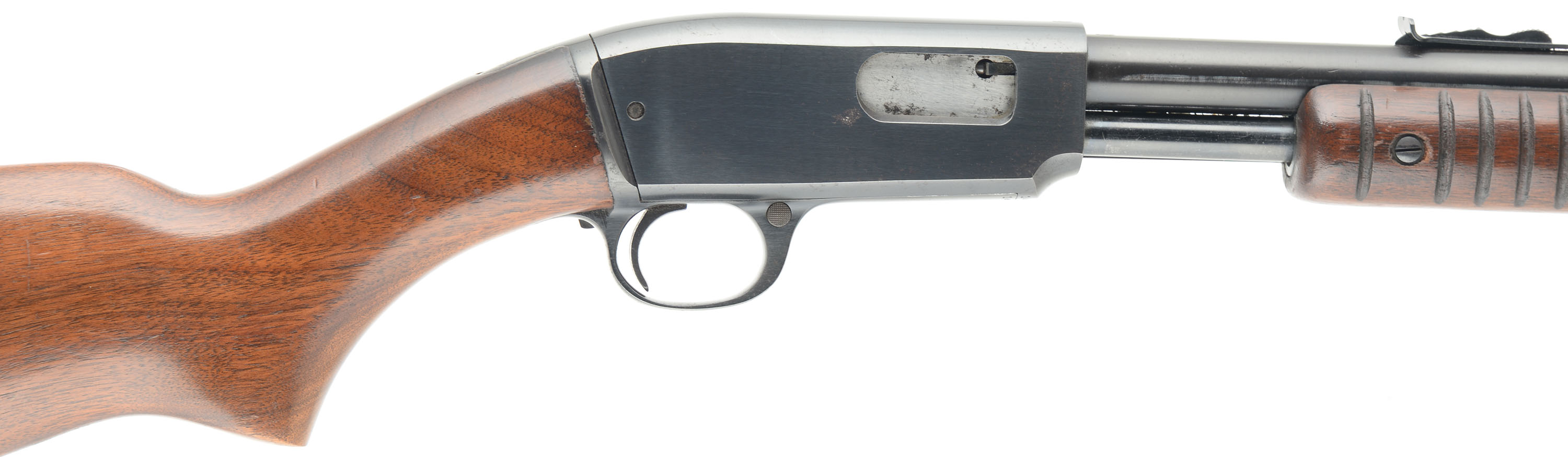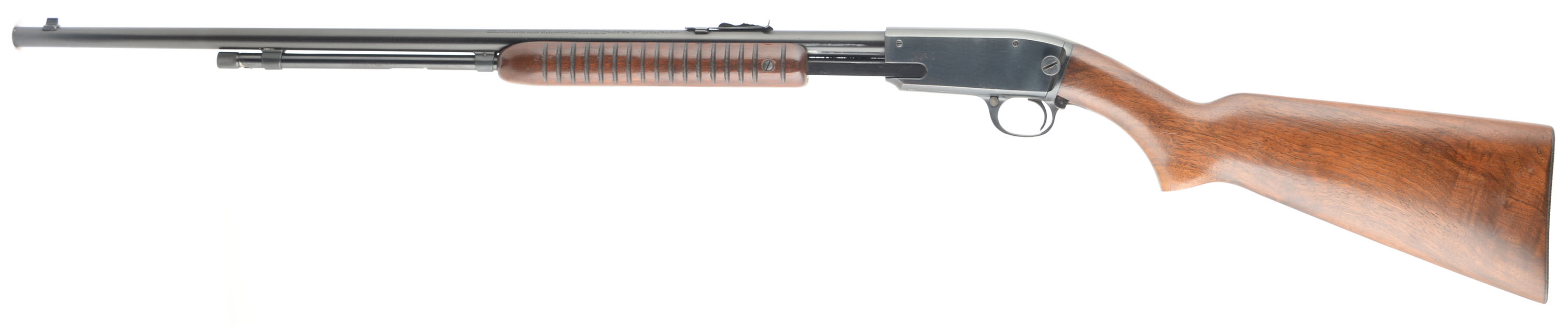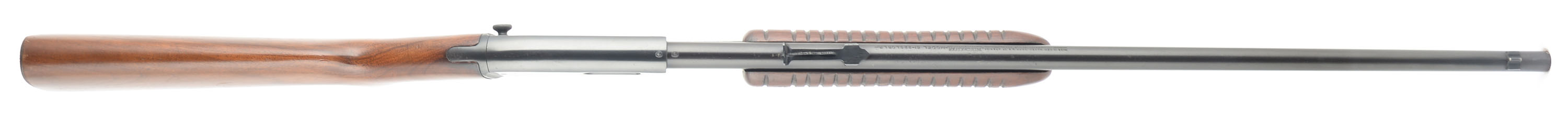 Winchester, Model 61, CAL: 22 S, L & LR, MFG: 1950, SN: 142379, Pump Action Take-down Rifle. 24'' tapered round barrel. The factory flat knob pistol grip wood stocks are excellent, displaying few minor contusions or scuffs to the excellent original finish. There is a small corner chip next to the pump release button on the wrist & a tight 2'' crack on the belly of the forend. The original metal blue finish rates 95% on barrel & mag tube, 90% on the receiver, with spotty loss on the receiver. Bore is excellent. Standard open sights. Factory checkered metal buttplate. Overall, an excellent condition & beautiful 61 rifle. FFL or C&R Req. - Value: 600 to 1000