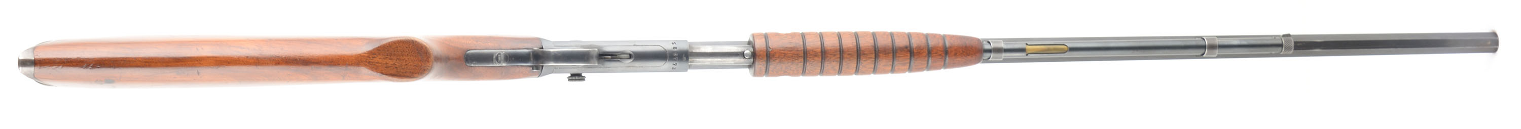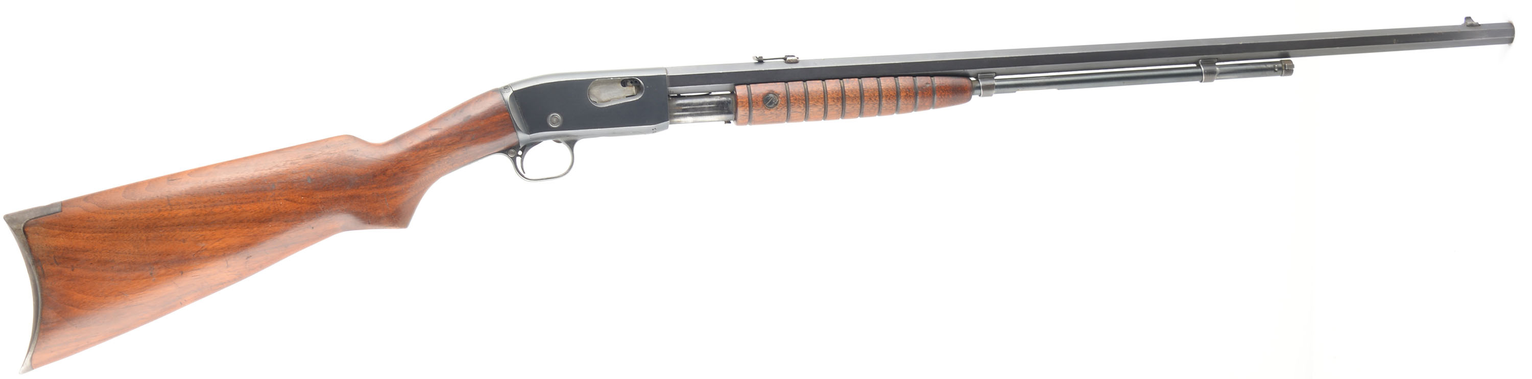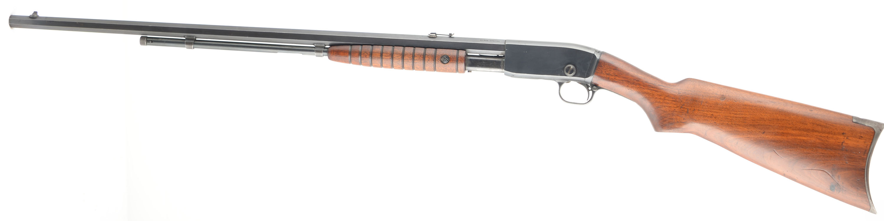 Remington, Model 12CS, .22 REM SPECIAL., MFG. 1909-20, SN: 586773, Pump Rifle, Take-down, 24'' Octagon barrel. The straight grip wood stocks are excellent, with minor to small handling marks, scratches & contusions to the original finish. The original metal blue finish rates 80% overall. The barrel is fitted with standard front & rear sights. Bore is excellent. Original crescent metal buttplate. FFL or C&R Req. - Value: 400 to 800