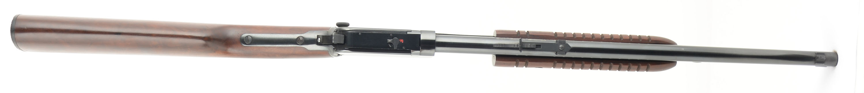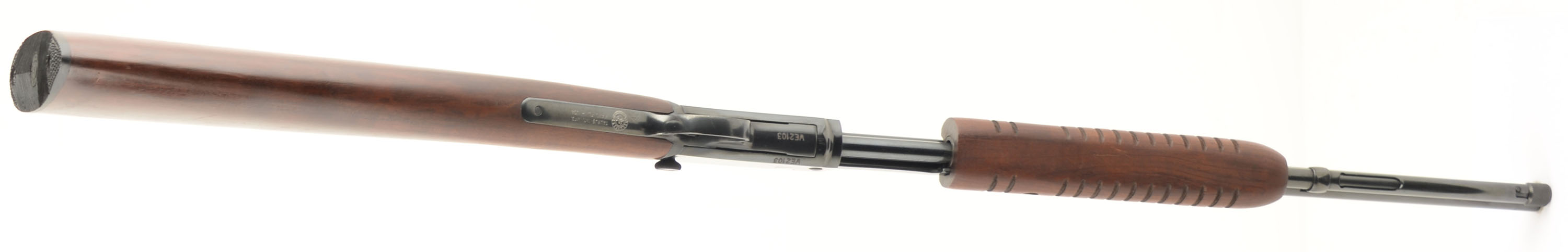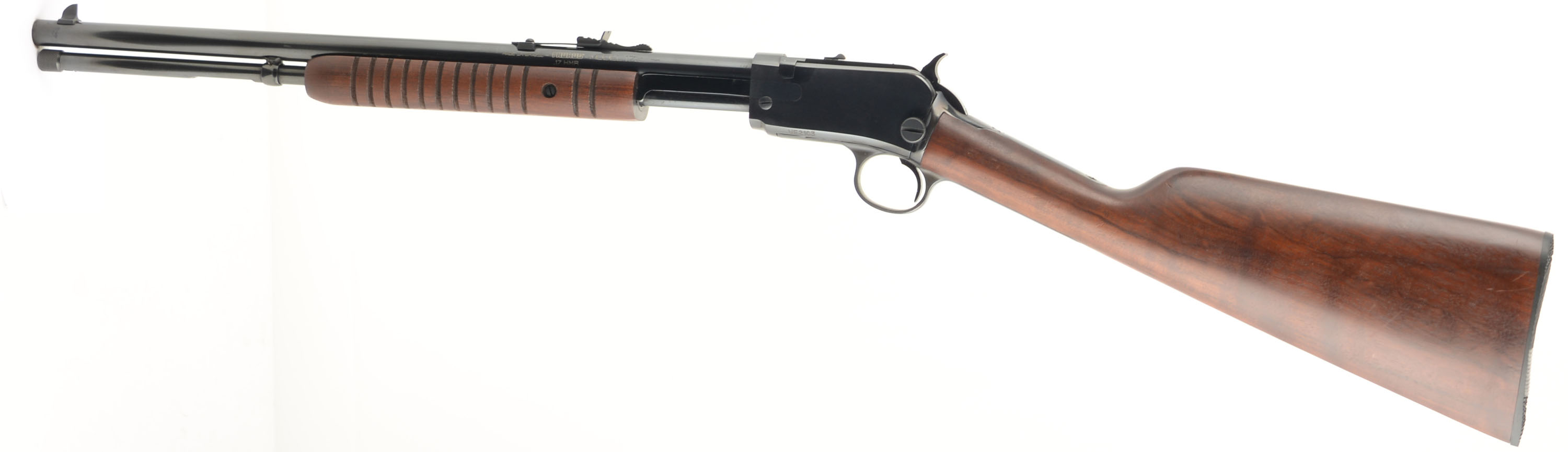 Taurus Model 172, marked .17 HMR, MFG. Modern, SN:WE2103, Pump Action Rifle, 16 1/2'' round barrel. Taurus' modern version of the famous Winchester model 62 rifle, but in the smaller .17 HMR caliber. The original straight grip wood stocks are excellent, with a couple of very minor rubs or surface blemishes to the original factory finish. The original metal blue finish is 98% overall. Bore is excellent. Barrel fitted with factory sights. Original checkered plastic buttplate. The forearm is the larger corncob style. An excellent original example. FFL Req. - Value: 200 to 300
