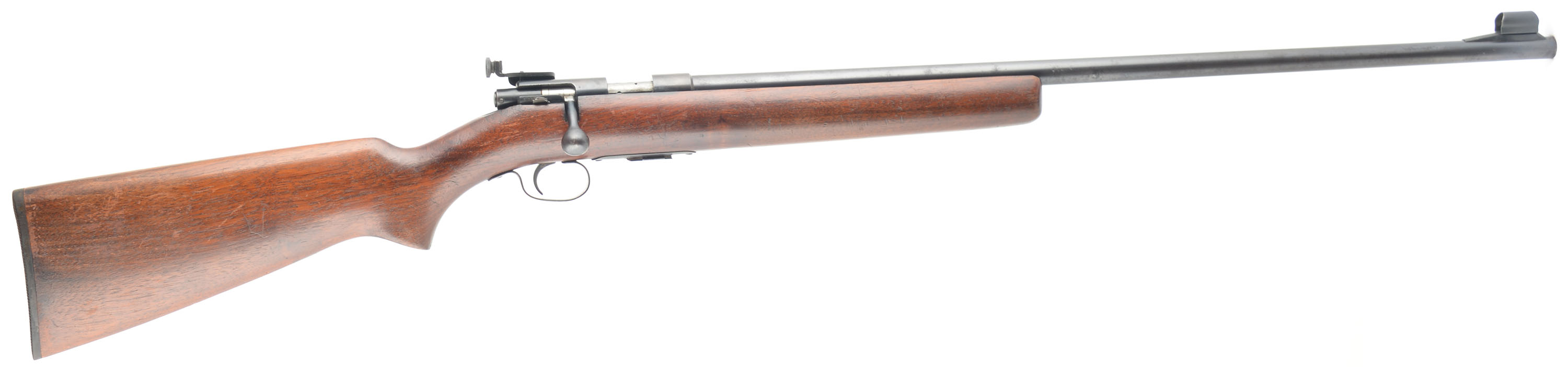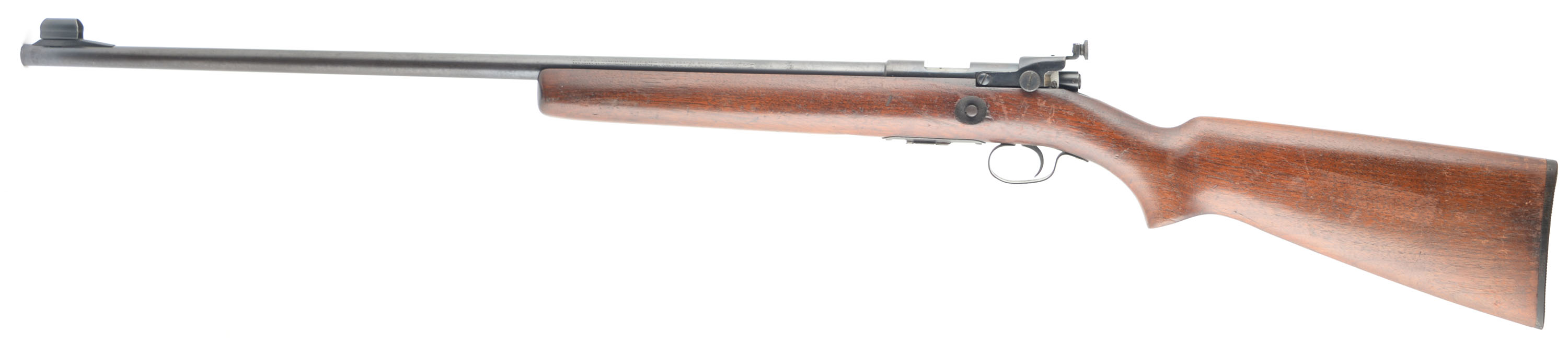 Winchester, Model 69A Target, CAL: 22 S,L,LR, MFG: 1935-63, SN: NONE, Bolt Action Rifle, 25 1/8'' barrel. The original flat pistol grip wood stock is excellent, but with numerous minor & finish level scrapes, scratches & contusions to the original finish. The metal blue finish rates 70% overall, with some speckling & spots of light cleaned pitting. Bore is excellent. Fitted with the receiver mounted aperture target sight & hooded blade front sight. Buttstock carries a Winchester marked, checkered black plastic buttplate. Comes with the original ''Winchester'' & ''69'' marked detachable magazine. Nice example. FFL or C&R Req. - Value: 300 to 500