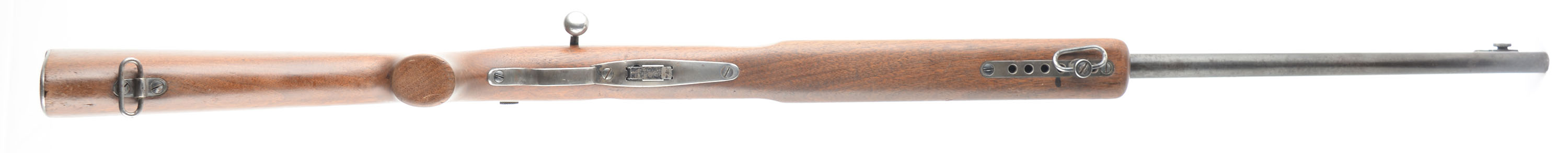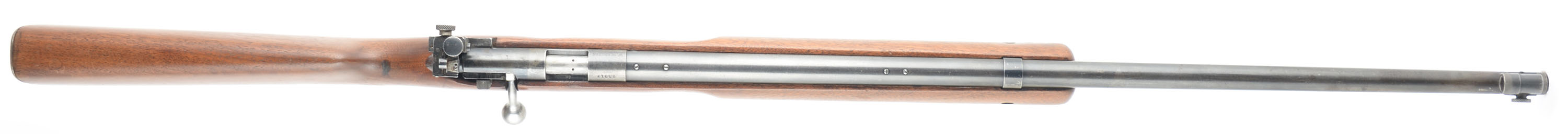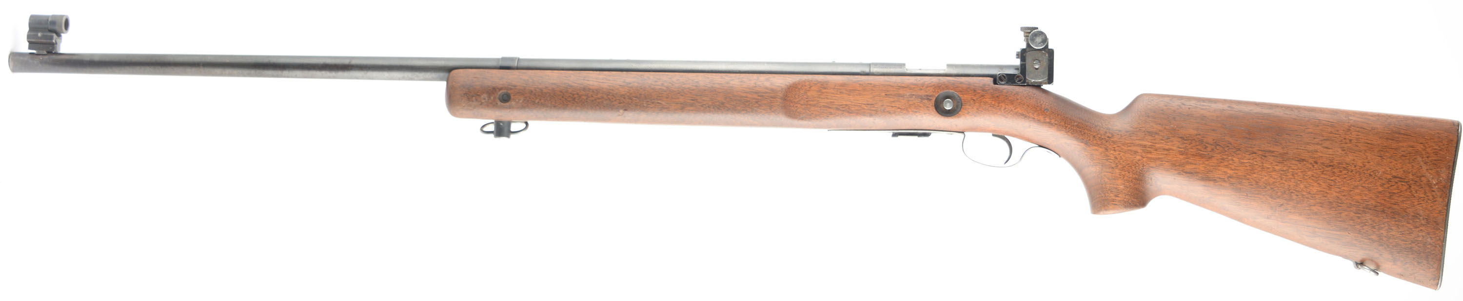 Winchester, Model 75 Target, CAL: 22LR, MFG: 1942, SN: 41658, Bolt Action Rifle, 28'' barrel. The original flat pistol grip target stock is excellent, with light scratches, scrapes, & contusions to the original finish. The original metal blue finish rates 30% overall, with the trigger guard worn mostly to metal gray. Bore is excellent. The receiver has a side mounted multi adjustable Lyman receiver sight, while the barrel holds an multi adjustable large hooded front post sight. Top of barrel is tapped & drilled, with (4) filled screw holes for scope mounting. Stock carries a checkered metal buttplate. Sling swivels. Original ''Winchester'' stamped mag. FFL or C&R Req. - Value: 500 to 1000