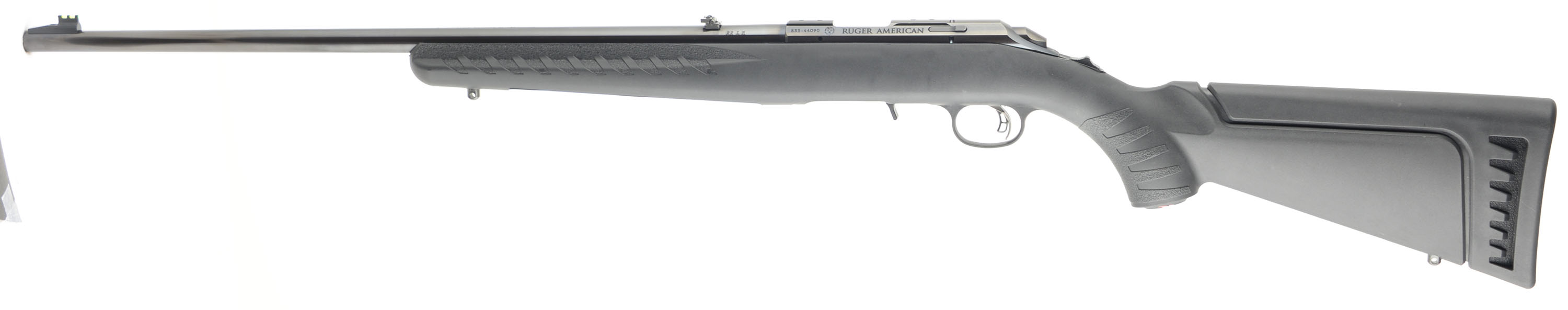 BOXED & NEW Ruger, Model American, CAL: 22 LR., MFG: Modern, SN: 833-44090, Bolt Action Rifle, 22'' barrel. The original Ruger logo capped pistol grip synthetic stock is mint, with 2 interchangeable stock modules to offer comb height options. The original metal blue finish rates 100% overall. Bore is mint. The barrel carries a folding leaf rear & factory fiber optic blade front sights. Buttstock carries a Ruger logo plastic buttend. Sling studs. Factory detachable mag. Factory retail stickers remain on buttstock & belly of forend. Comes in the original box, with extra Monte Carlo style stock piece, lock & paperwork. Basically, new in box. FFL Req. - Value: 300 to 400