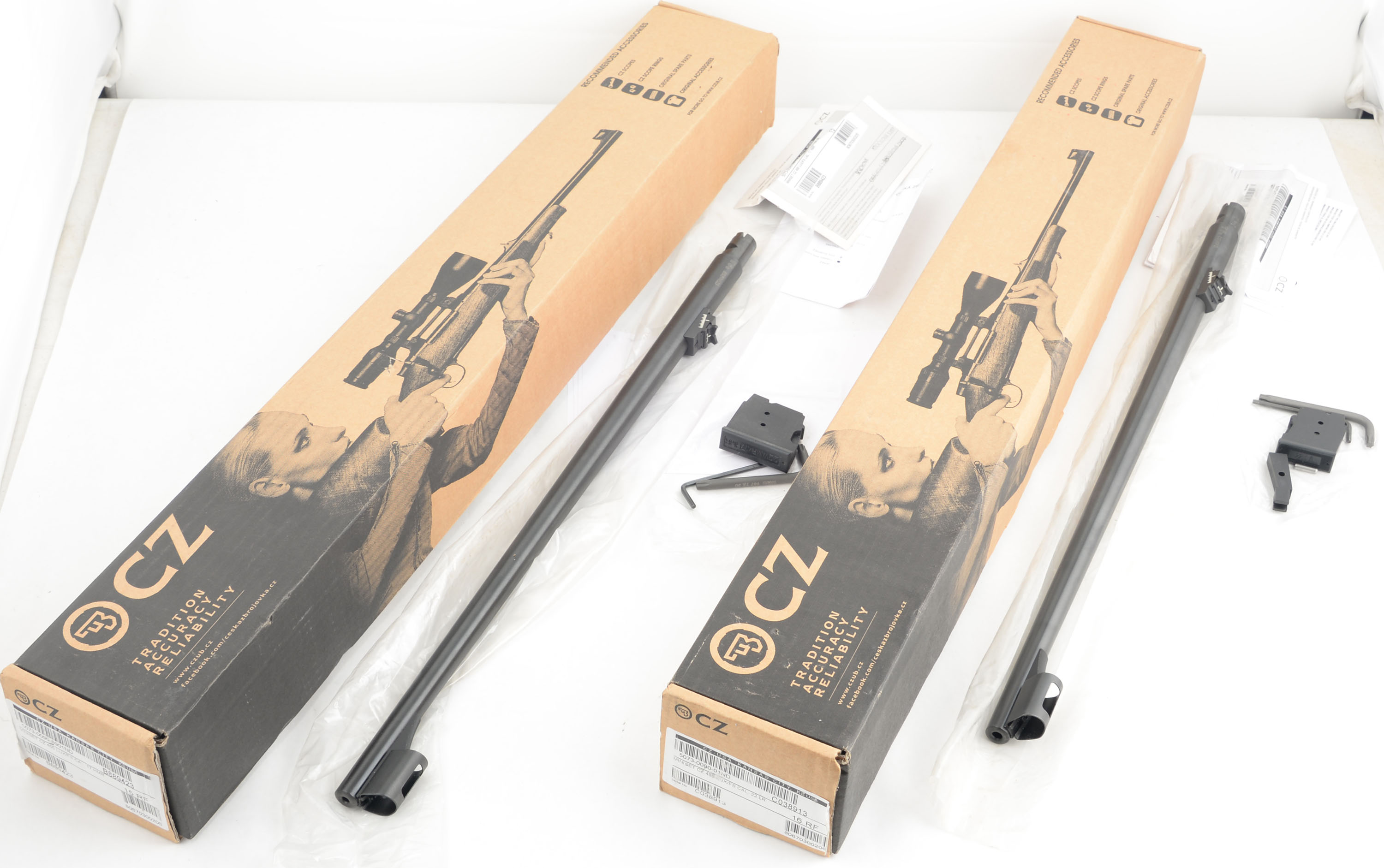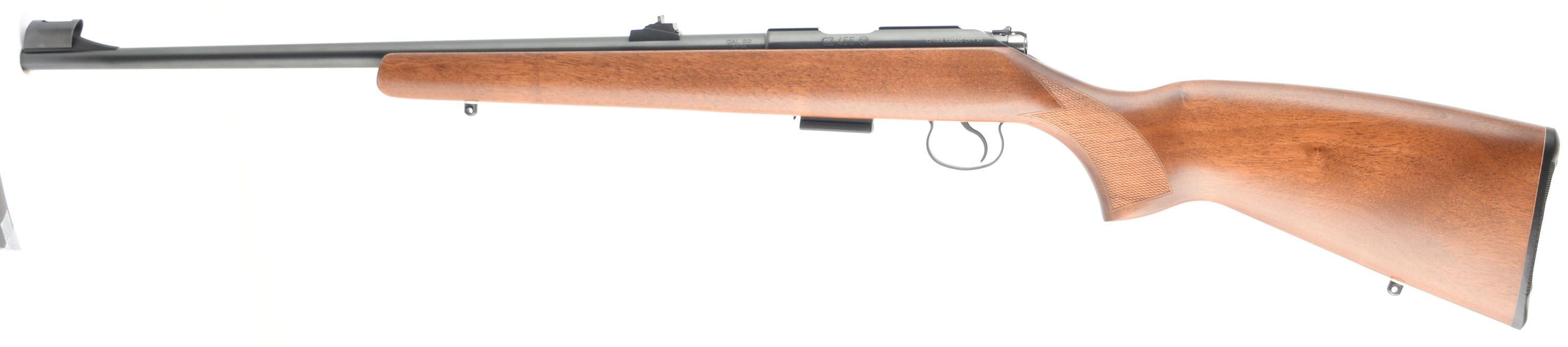 BOXED CZ, 455 LUX, CAL: 22 WMR, MFG: 2011-18, SN: B024322, Bolt Action Rifle, 20 1/2''. The factory checkered wood stock is excellent, solid with little to no wear. The stock has two sling studs. The checkered plastic buttplate is very good with some wear, the left edge has some roughness. The blued finish on the receiver and barrel rates approximately 99% with very minimal wear. The factory markings are excellent. Bore is excellent, bright and strong. Mechanically solid, seems to function well. The gun has blacked out target sights. A shrouded front post sight and windage and elevation adjustable rear sight are screwed to the barrel. The top of the receiver has an integral dovetail rail. Comes in the serially matched factory box with a 22 WMR/17 HMR magazine, an owners manual, and other related paperwork. The gun also comes with two boxed factory conversion kits, one for 17 HMR and one for 22 LR. The kits each include a barrel, a magazine, allen keys, owners manuals, and other related paperwork. The bores and finishes on the extra barrels are excellent with each having some scratches on the outside of the barrel near the chamber (probably from being installed incorrectly/too tight). FFL Req. - Value: 400 to 800