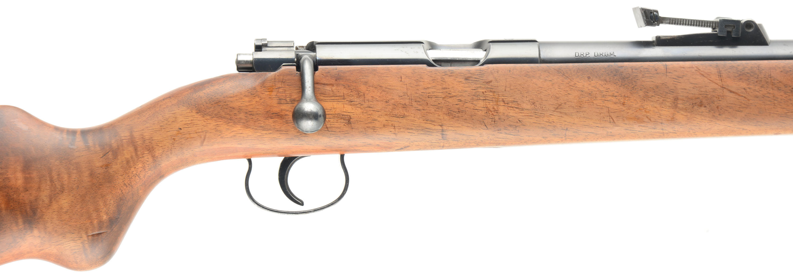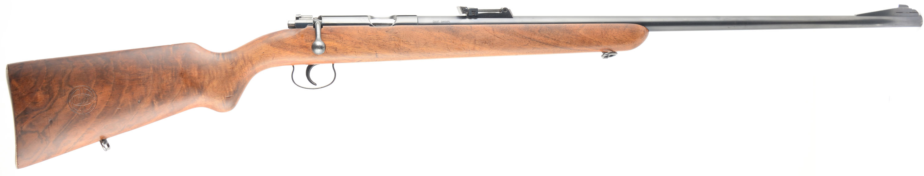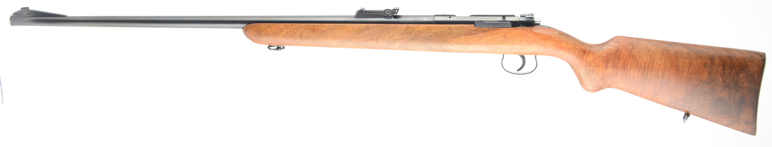 Mauser-Werke AG Oberndorf, Model: ES340B Meister Schaft Target Rifle (Championship), Cal: .22 LR, MFG: 1930's, S/N: 188269, Bolt action rifle, 26 3/4'' barrel. The original semi-pistol grip wood stock is excellent, with numerous minor scratches, scrapes & light contusions to the finish. There is a ''Mauser'' cartouche stamped on the right side stock. Lovely rippled grain displayed on the stock. The metal blue finish rates 85% overall. The bore is excellent & bright. The barrel holds the original slide adjusting rear range sight made similar to the K98K sights & a ramped blade front sight. The stock carries the original Mauser stamped metal buttplate. Sling loops. FFL or C&R Req - Value: 300 to 600
