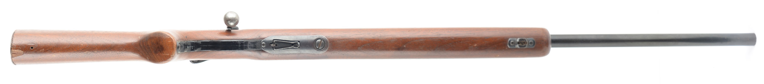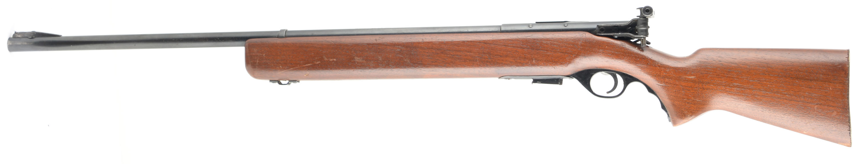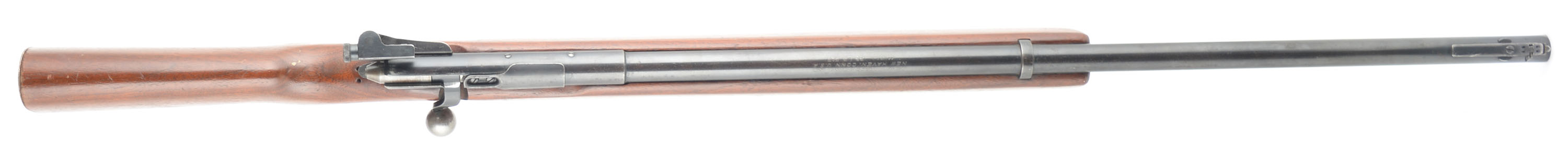 O.F Mossberg & Sons Model 44 US, CAL: 22 LR, MFG: 1943-44, SN: None, Bolt Action Rifle, 26 1/4'' Round barrel. Rifles like these were U.S. target training rifle used by all branches of the military & often stamped U.S. Property. This rifle is not stamped U.S. Property. The factory flat knob & finger grooved pistol grip wood stock is very good, with several minor scratches, nicks & dings. The stock has been cut to a 10 1/2'' LOP & carries a serrated metal buttplate. Has a 1/2'' chip at the toe & a hole from sling stud removal. Has a plastic finger grooved grip. The original metal blue finish rates 70%, with speckling. Bore is excellent. The receiver carries the sight mount, but without the target sight, while the barrel has no rear sight provision & a ramped four flip-up blade option front sight. Sling swivel front provision. Detachable mag. Approx.. 53,000 produced. FFL or C&R Req. - Value: 150 to 300