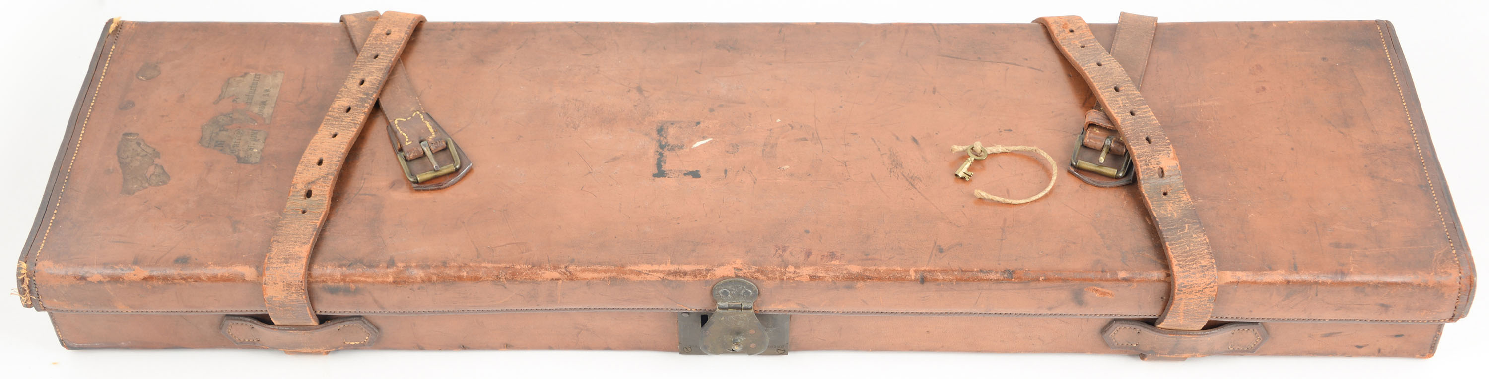 CONDITION: The original checkered, capped & beaded cheek stock is excellent. The checkered forend is excellent. There are some minor scrapes & contusions to the stocks. There appears to be a thin layer of added protective oils or finish, over the original finish. The browned finish on the Damascus barrels is excellent. The fingerprint pattern is prominent. The receiver, side plates, hammers, break lever, trigger guard, lower strap, forend break lever, grip cap, buttplate & sling eyelets are all beautifully, intricately & tasefully hand engraved with fine floral & ornamental scroll work. The case-hardened receiver, side plates, hammers, break lever, trigger guard, buttplate & eyelets all display excellent case-colors. The case-colors are more noticeable in protected areas, with handling areas worn to metal gray, with shadowing remaining. Bores are excellent. The solid, matted rib holds a single front bead that appears to be interchangable. Engraved & checkered buttplate. Sling eyelets. Comes in original leather case, with green interior. There is an A.H label on the inside lid. The case has normal wear from use. There are some popped stitches on the corners/edges & the left handle loop is torn. Antique, No FFL Req. - Value: 4000 to 10000
