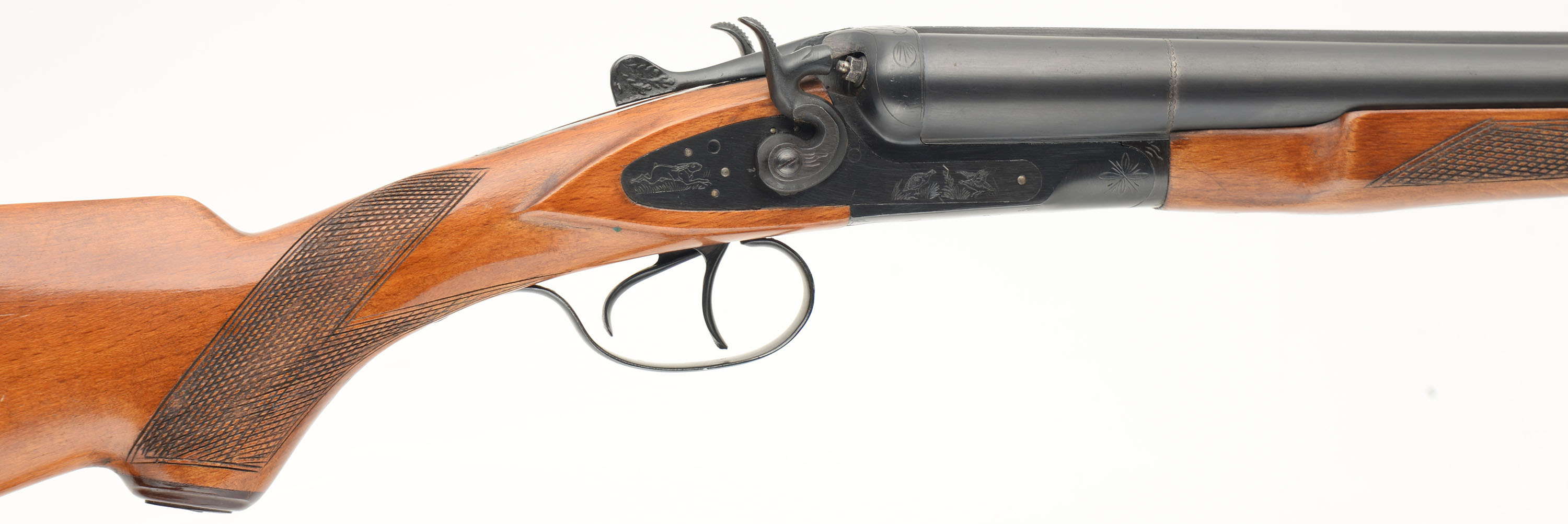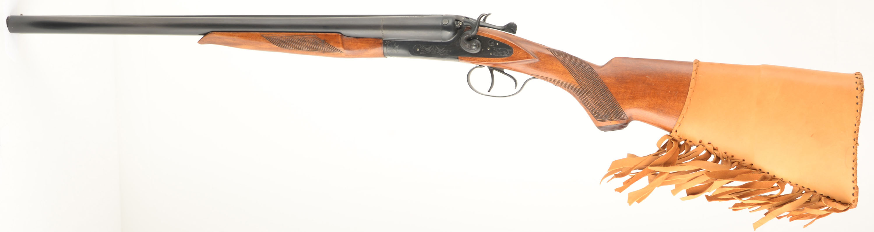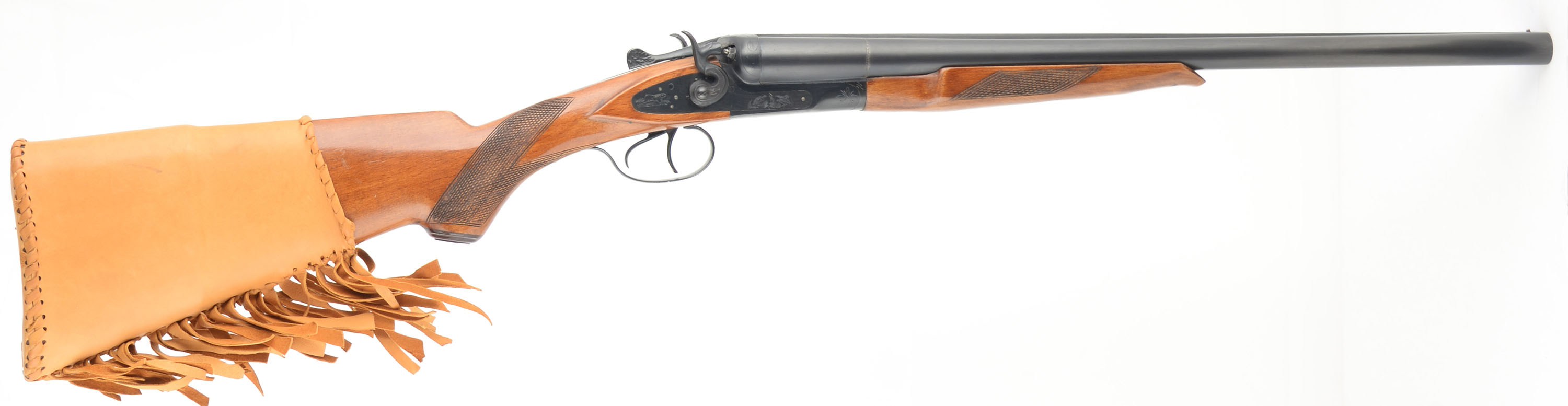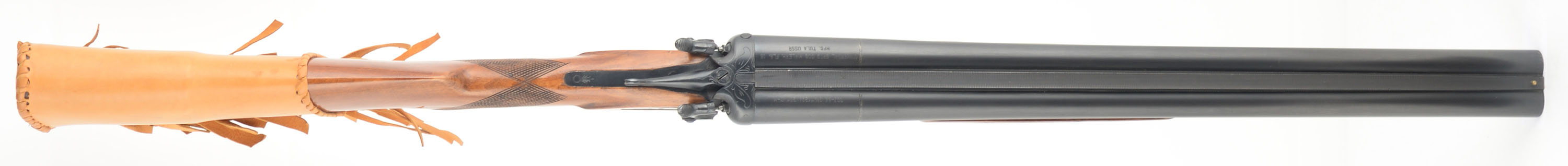Tula - USSR (Universal Sporting Goods), TOZ-66, CAL; 12GA, MFG: 1970's-80's, SN: P8964, Break Action SxS Shotgun, Choke: IC/M, 2 3/4'' Chamber, 20'' barrels. Standard markings on the barrels. The checkered, capped pistol grip stocks are excellent. There are minor handling marks & dings to the finish. Both sides of the receiver display a pointer & two ducks, with ornamental accent engravings. The metal blue finish rates 95% overall. Bores are excellent. The solid matted rib holds a single front bead. Stock has a padded leather cover, with recoil pad underneath. Double triggers. LOP: 15 3/4'' overpad. Mechanical operation appears to function properly.