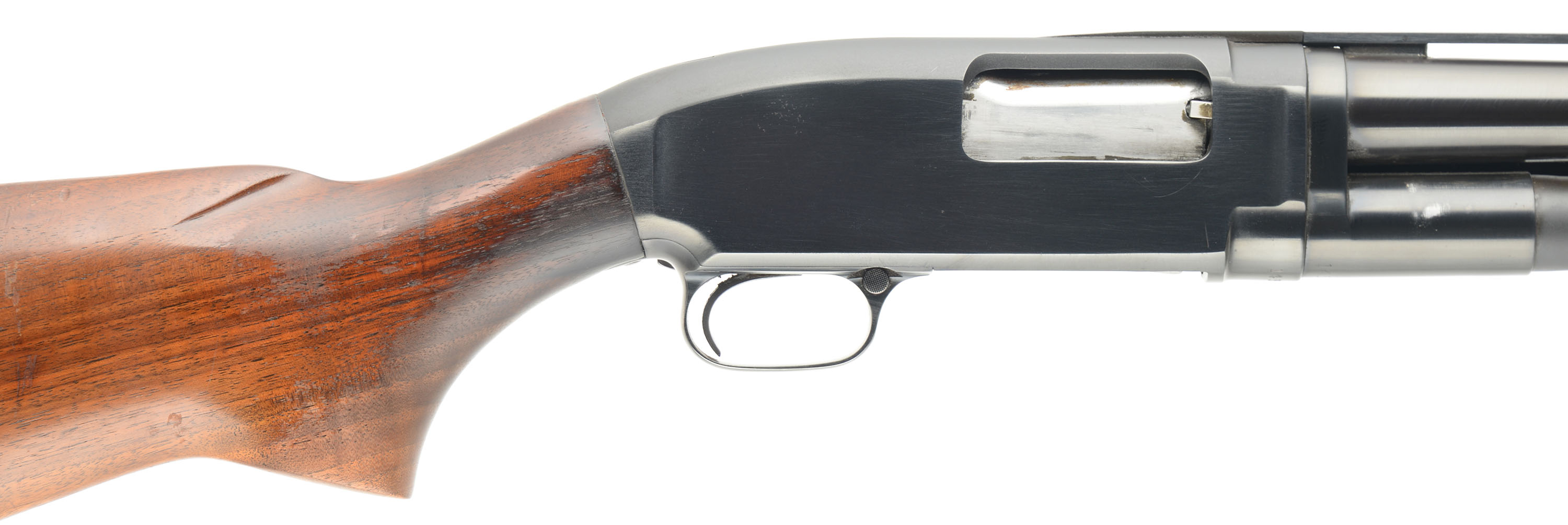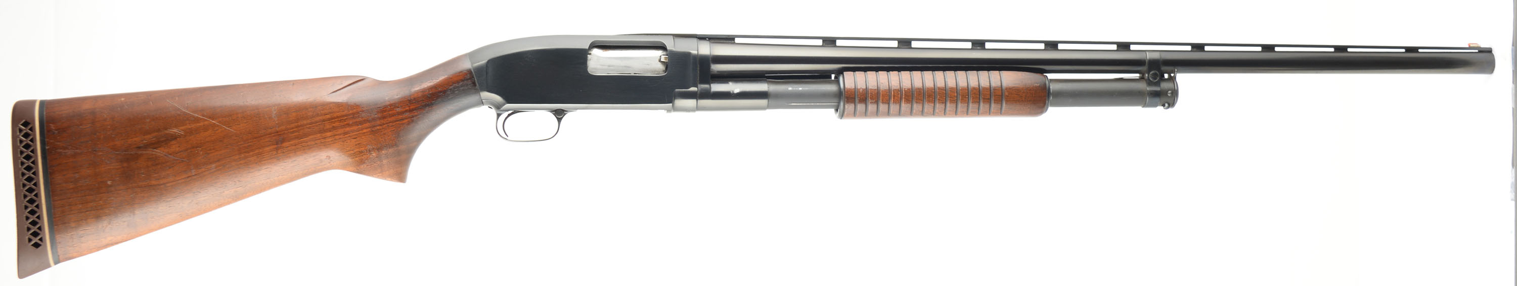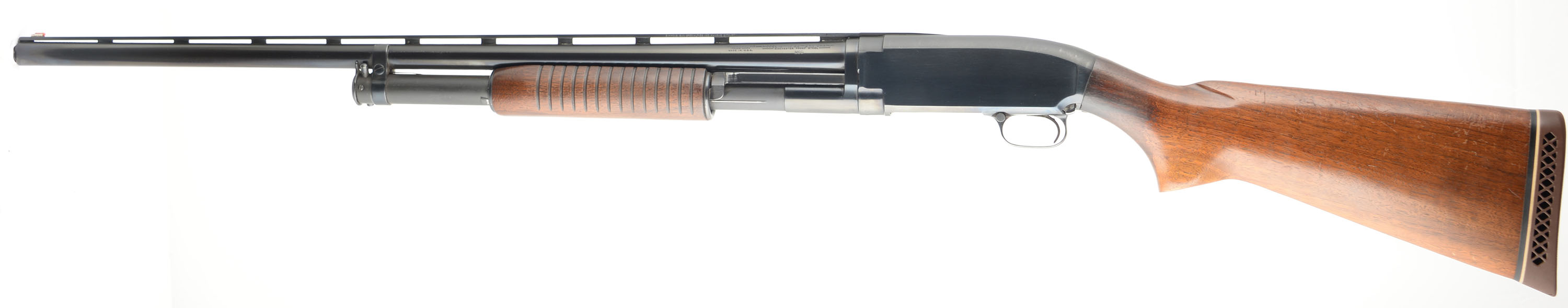 Winchester, Model 12, 12 Ga., MFG. 1951, SN: 1430420, Pump action. Marked MOD Choke, 2 3/4'', 28'' Vent. Rib barrel, The original flat pistol grip wood stocks are excellent, with minor handling marks, scratches & light contusions to the original finish, which is thinning at the wrist & belly of the forearm. The metal blue finish rates 90% overall, with the barrel starting to tone a bit plum. The ventilated rib is a Simmons rib, with a single front bead. Bore is very good. 14 5/8'' LOP over the Pachmayr White-Line ventilated recoil pad. FFL or C&R Req. - Value: 400 to 800