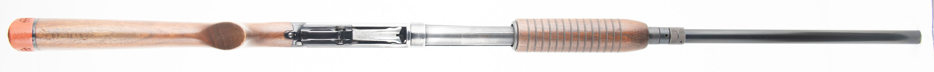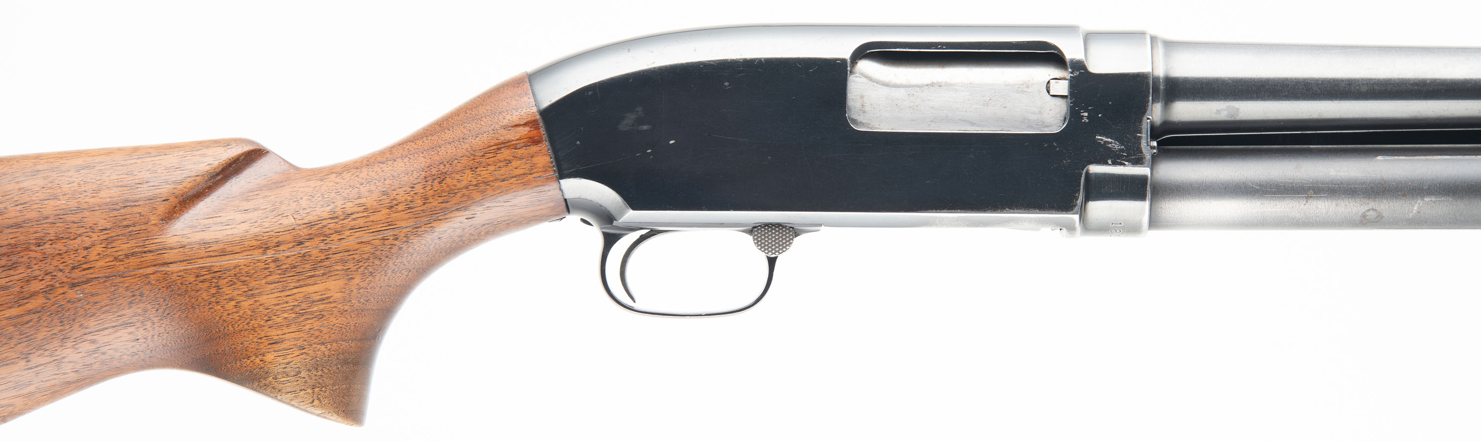 Winchester, Model 12 Solid Frame Featherweight, 12Ga., MFG. 1958, SN: 1810745F, Pump action. Marked FULL Choke, 2 3/4'', 26'' barrel, The original flat pistol grip wood stocks are very good, with a minor scrapes, scratches & light contusions to the thinned original finish. There is a 2'' crack at the forend tip. The original metal blue finish rates 90% on the barrel, 80% on the receiver & mag tube. Bore is excellent. Single front bead. Stock carries ventilated recoil pad. 13 3/4'' LOP. FFL or C&R Req. - Value: 300 to 600