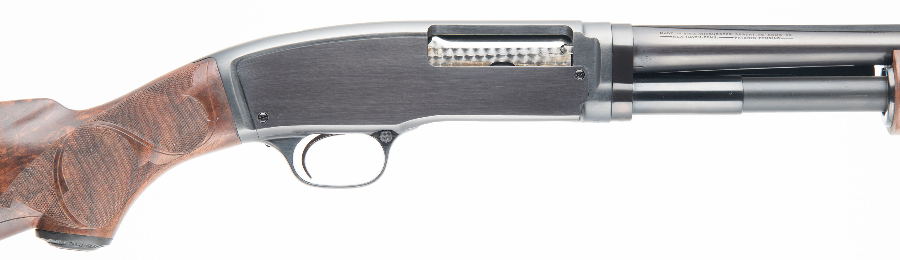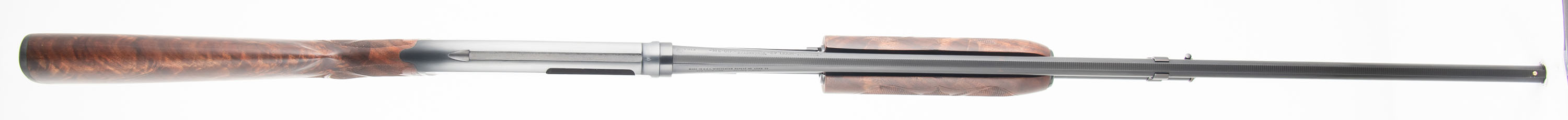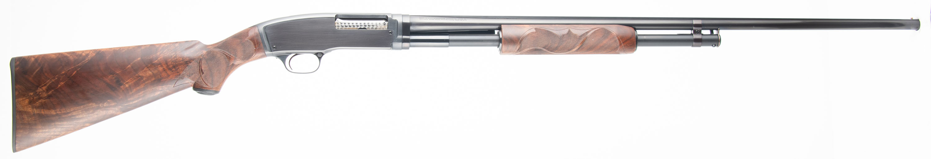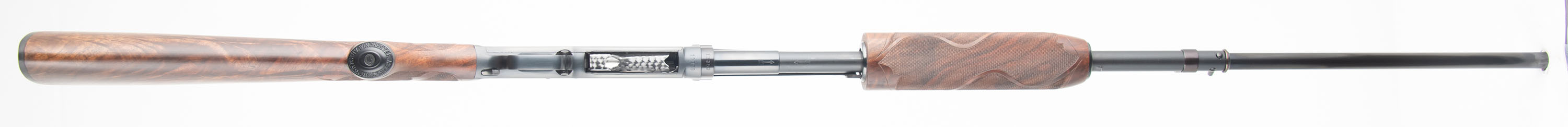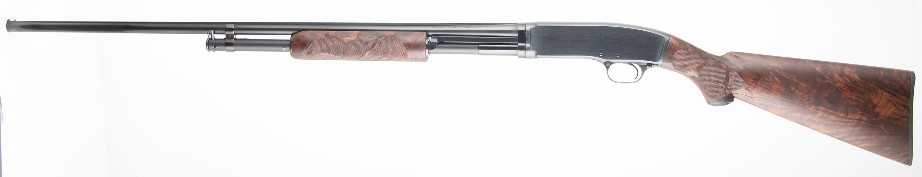 Winchester, Model 42 CUSTOM DELUXE, 410 GA., MFG. 1933, SN: 13359, Pump action, 3'' Chamber, Choke: FULL marking, 28'' Ribbed barrel. First year production. This shotgun was fully & professionally restored. The upgraded deluxe checkered/carved & capped pistol grip, exhibition grade wood stocks are excellent, with virtually no handling marks. The rippled & feathered contrasting wood grain is fantastic, while the checkering is sharp & the finish excellent. The restored metal blue finish rates 99% overall. Stampings remain full. Bore is excellent. The barrel rib carries a single front bead. Buttstock carries a Winchester checkered plastic buttplate. An overall excellent condition & very sharp appearing first year model 42. FFL or C&R Req. - Value: 2500 to 4000