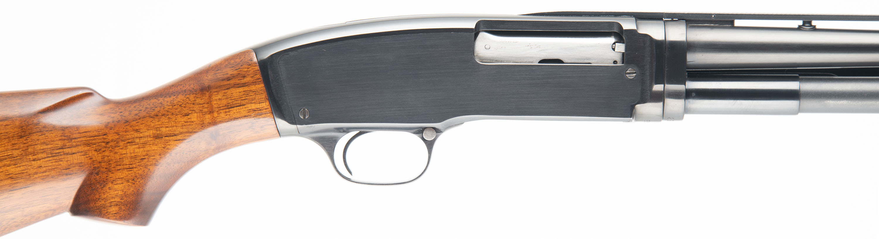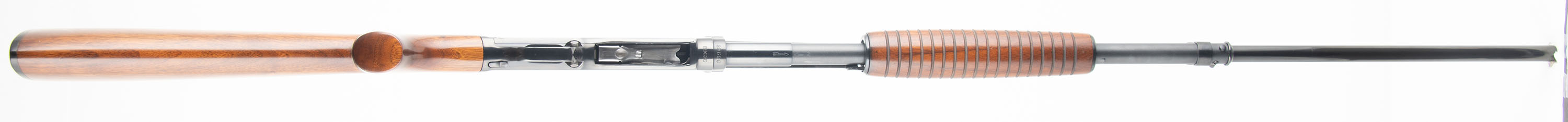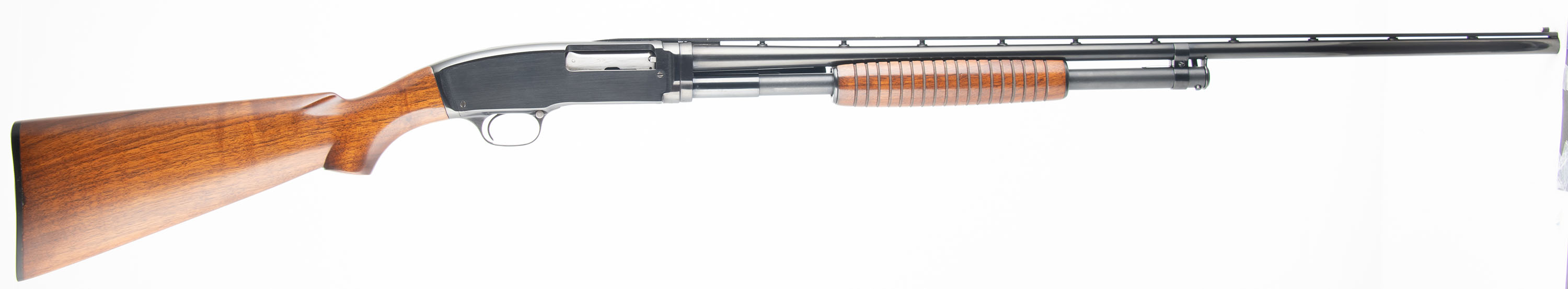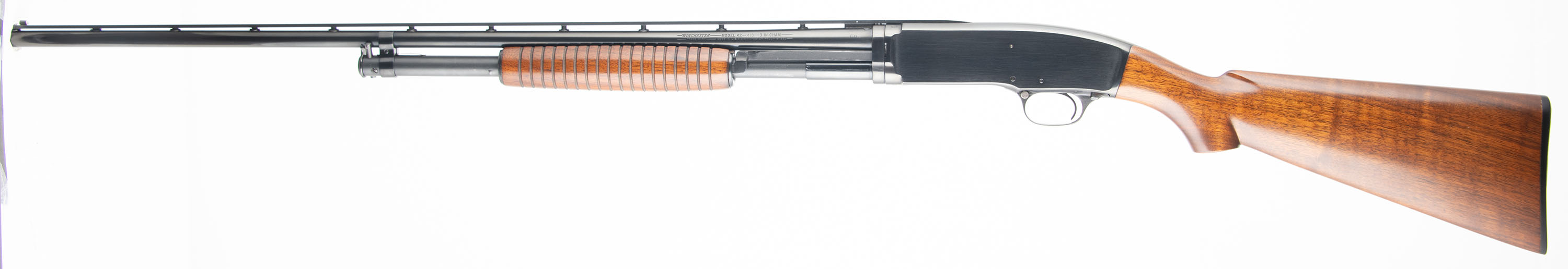 RARE CYLIDNER CHOKE, Winchester, Model 42, 410 GA., MFG. 1950, SN: 89626, Pump action, 3'' Chamber, Choke: CYL, 28'' donut post, Ventilated ribbed barrel. Only a couple of thousand CYL choke model 42's compared to the 164,800 made in total from 1933 to 63. The majority of the CYL guns had 26'' barrels rather than the 28'' this gun has. This shotgun was fully & professionally restored. The original flat pistol grip wood stocks are excellent, as professionally refinished & with virtually no handling marks. There appears to be no wood loss during the restoration process & the overall look & finish is excellent. The restored metal blue finish rates 99% overall. Stampings remain full. There are a few cleaned pit marks under the blue on the pump bar. Bore is excellent. The ventilated rib carries a single front bead. Proof stampings on receiver & barrel are to the left of the rib, which is correct. Buttstock carries a Winchester checkered plastic buttplate. An overall excellent restored condition 42, with a fantastic appearance. FFL or C&R Req. - Value: 2000 to 4000