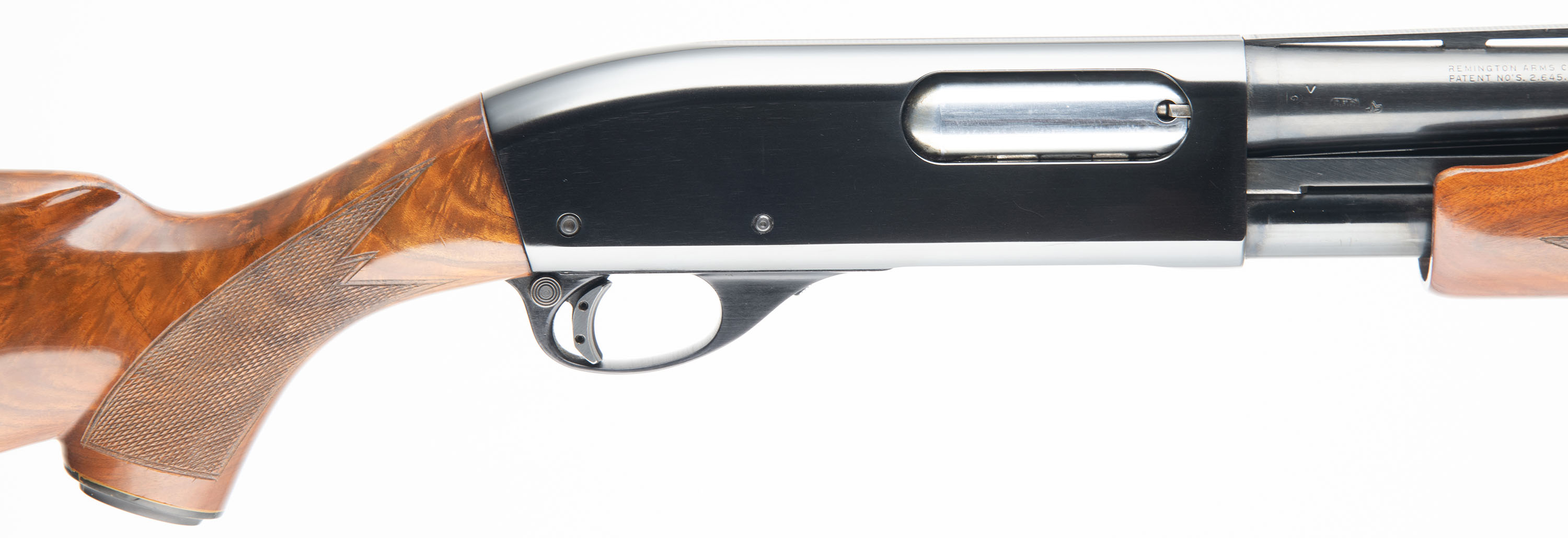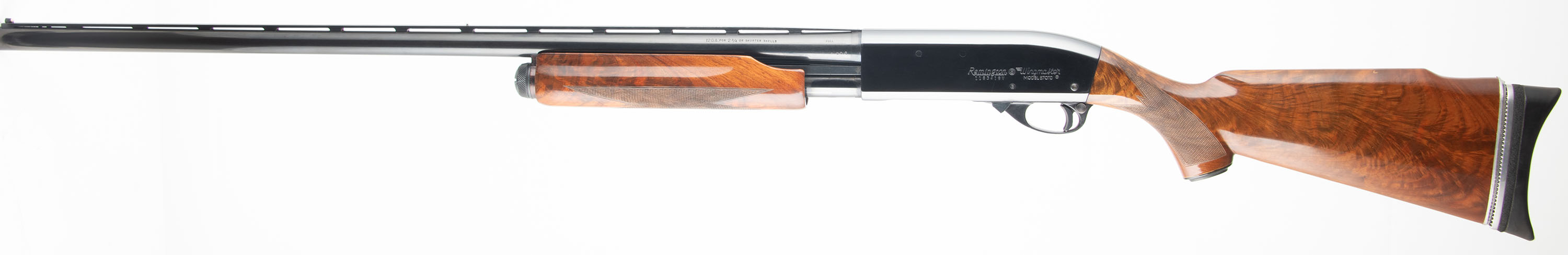 Remington, Model 870TC Wingmaster, CAL: 12GA, MFG: 1968, SN: 1163419V, Pump Action Shotgun, Choke: Marked Full (Measures Imp Mod), 2 3/4'' Or Shorter, 30'' Ventilated rib barrel. The original checkered & capped pistol grip deluxe wood stocks are excellent, with very few shallow dings, scratches & light wear to the excellent original finish. The original metal blue finish on the receiver & barrel rates 99%, with a bit more wear to the magazine tube. Bore is excellent. The serrated ventilated rib holds mid rib & front bead. The stock carries a Morgan Adjustable Recoil Pad Co. curved recoil pad. LOP is 14 3/4'' over pad. Mechanically excellent. FFL or C&R Req. - Value: 1000 to 1500