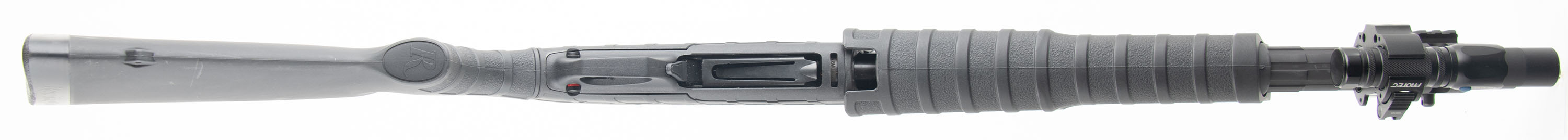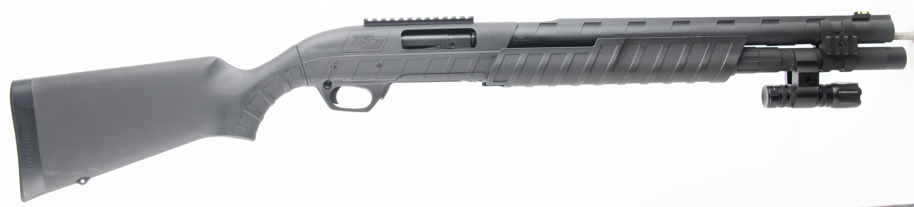 Remington, M887 Nitromag, CAL: 12 GA 2 3/4'', 3'', Or 3 1/2'', MFG: Modern, SN: ARM012083, Pump Action Shotgun, Choke: Thread in Choke (Missing), 18 1/2'' Barrel With a Plastic Rib and Barrel Shroud. The plastic stock and forend are in very good condition with some handling wear. The black finish on the gun is very good with some wear. Bore is very good, very bright throughout and smooth through most of the bore with some roughness in the middle. Mechanically solid, seems to function well. The rib holds a fiber optic front sight. There is a picatinny rail on the top of the receiver. The stock has a sling hole and the barrel clamp has a sling stud and picatinny rail. The magazine tube has an extension. There is a Protec Nebo light clamped to the magazine tube extension. The stock has a factory Remington recoil pad. LOP is 13 3/4'' over pad. FFL Req. - Value: 100 to 300