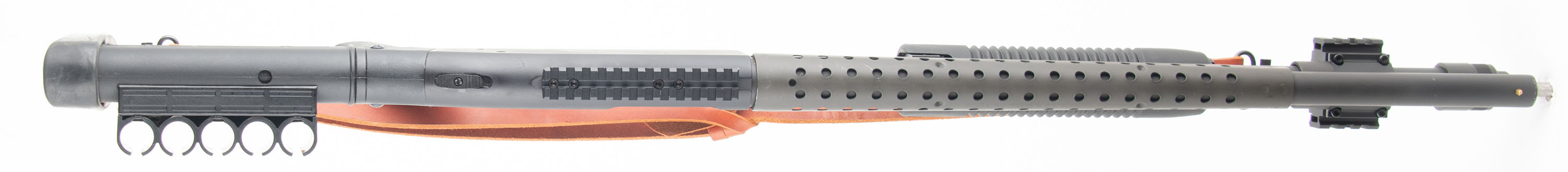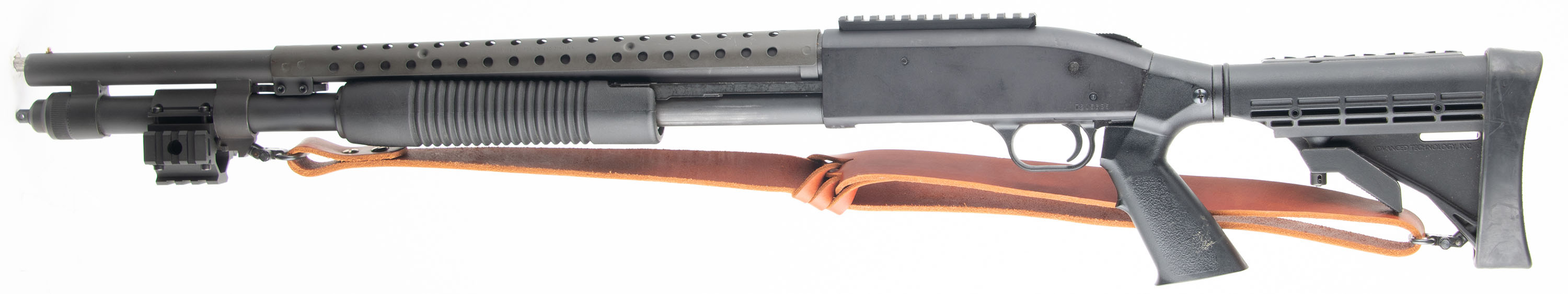 Mossberg, 590, CAL: 12 GA 2 3/4'' or 3'', MFG: Modern, SN: T215628, Pump Action Shotgun, Choke: CYL+, 20 3/4'' Barrel With a Metal Heat Shield. The black plastic stock and forend are very good, solid with some handling wear. The black finish on the gun is very good with some wear. Bore is excellent, very bright and smooth. Mechanically solid, seems to function well. The barrel holds a front bead sight. The gun has a plastic pistol grip and collapsible stock. The gun has a set of picatinny rails clamped to the magazine tube as well as a picatinny rail on top of the frame. There is a Montana Slings two point sling on the gun. The LOP is 10 3/4'' - 14 1/2''. FFL Req. - Value: 350 to 700