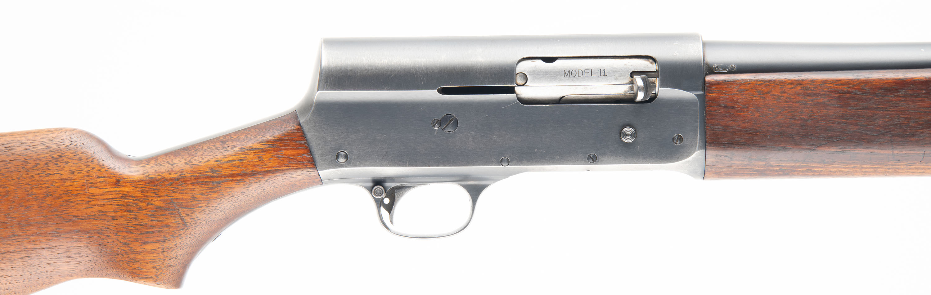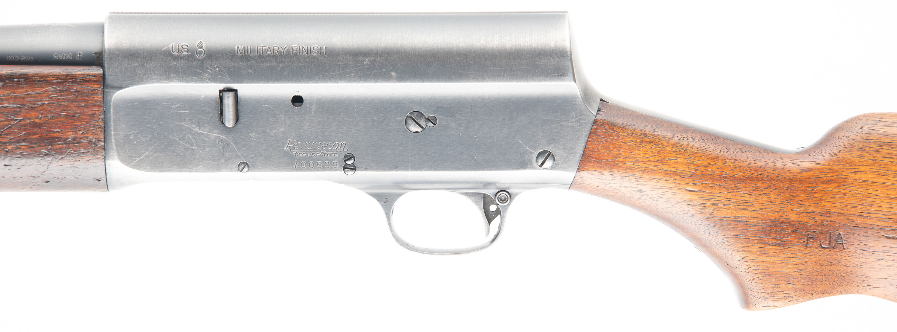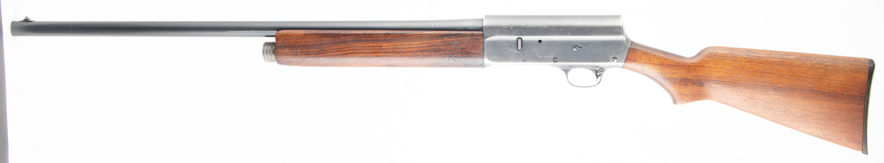 MARKINGS: The barrel is marked with the standard address/patent dates stamp, the caliber, chamber size, choke & barrel date code. The top of the barrel is marked ''U.S.'' next to a Flaming Bomb. The left side of the receiver is also marked with the same ''U.S.'' next to a Flaming Bomb & ''MILITARY FINISH''. The lower portion of the receiver is marked ''REMINGTON'' over the full SN. The bolt is marked ''MODEL 11''. The left side of the stock has two cartouches, one is the ''Cross Cannons'' proof, next to ''FJA'' for inspector Frank J. Atwood.