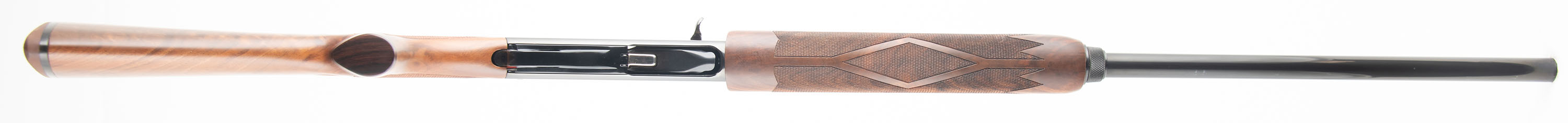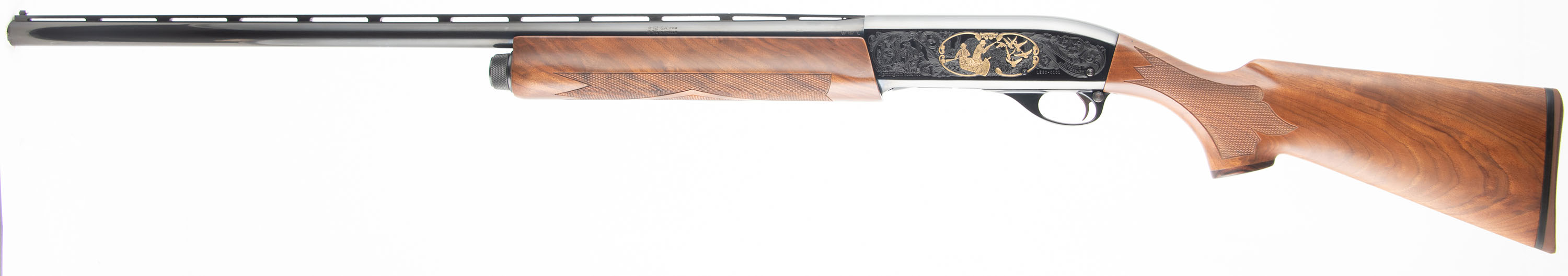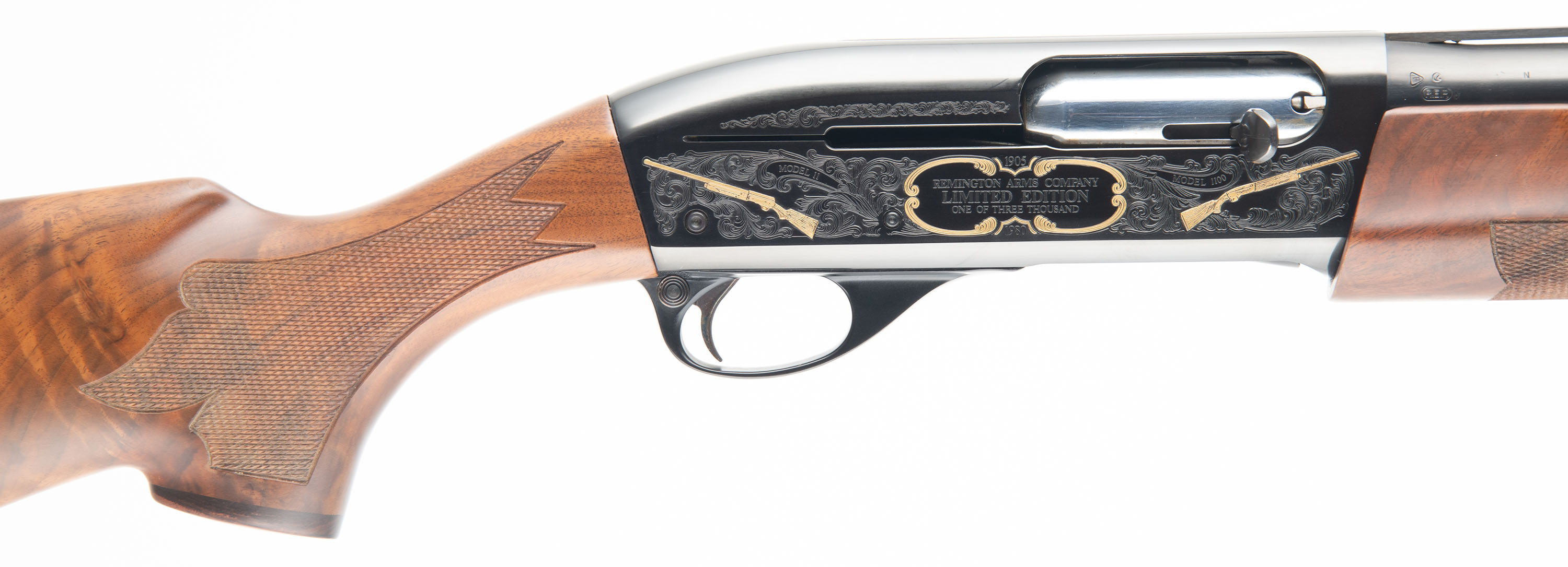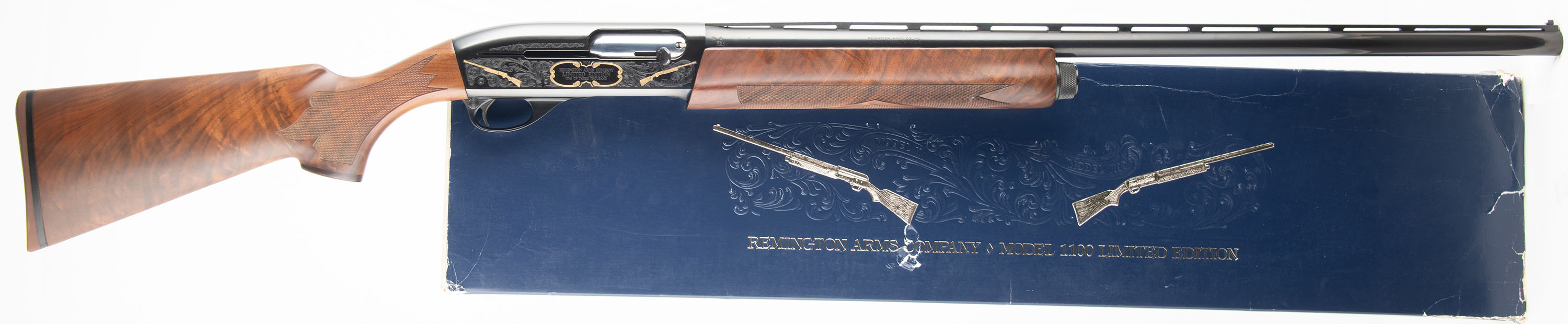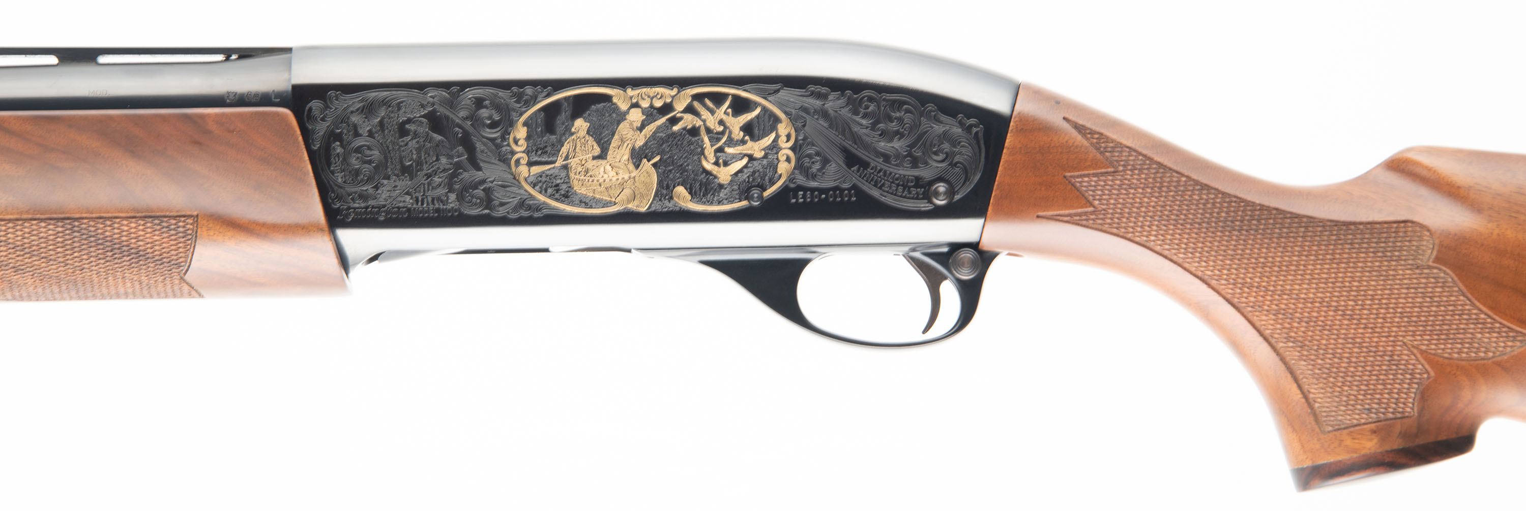 BOXED, Remington, Model 1100 - Diamond Anniversary: Limited Edition One of Three Thousand. CAL: 12GA, MFG: 1980, SN: LE80-0101, Semi Auto Shotgun, in 1981 Remington introduced in their catalog ''The First Model 1100 in the Collector's Field, a factory custom ordered 1100 to honor the ''75 years in pursuit of excellence in autoloading shotguns. This gun came to us NIB, not assembled. We were the first ones to assemble it for photography purposes. The original checkered, capped pistol grip stocks are mint. The original blued finish on the barrel rates 100% & the Japan black receiver rates 100%. The gold inlays are mint. The right side of the receiver displays a gold inlay Model 11/ Model 1100 & there is a gold border around the wording. The left side of the receiver displays a gold inlay bird hunting game scene. Bore is mint. The ventilated rib holds a single white front bead. Stock has a Remington brown rubber recoil pad. Comes in original commemorative box, with related paperwork. FFL Req. - Value: 1200 to 1800