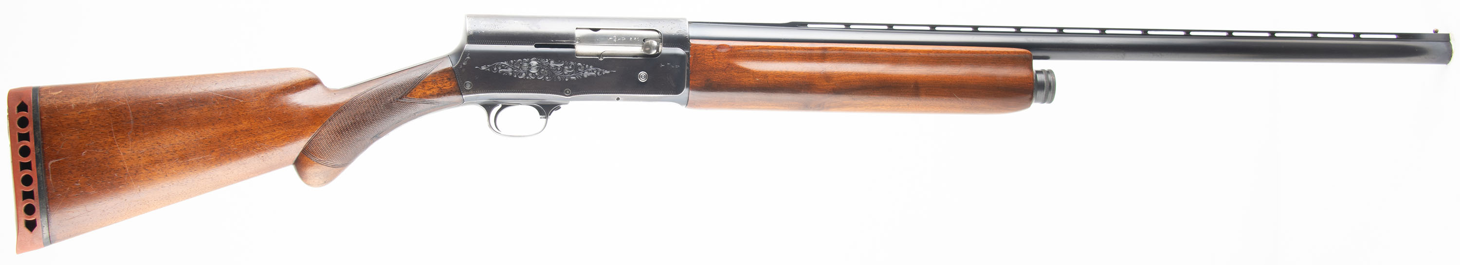 Updated 8/11/25: FN (Browning) Auto-5, CAL: 12GA, MFG: Late 1930's, SN: 226551, Semi Auto Shotgun, Choke: Full, 2 3/4'' Chamber, 25 1/2'' barrel. Standard markings on the left side of the barrel alongside multiple proof marks. The left side of the receiver has standard markings, the right side has proof marks. Full SN on the bottom of the receiver. The checkered round knob stock & plain forend are excellent. The stocks have been cleaned, with an added layer of finish. There are light scratches, scrapes & dings to the applied finish. The forend is most likely a replacement. The original metal blue finish rates 90% on the barrel & the receiver rates 70%. Bore is excellent, with visible light wear from honest use. The ventilated rib holds a single front bead. Stock carries a Red Head ventilated red rubber recoil pad. Mechanical operation appears to function properly. LOP: 14 3/4'' overpad. FFL or C&R Req. - Value: 400 to 800