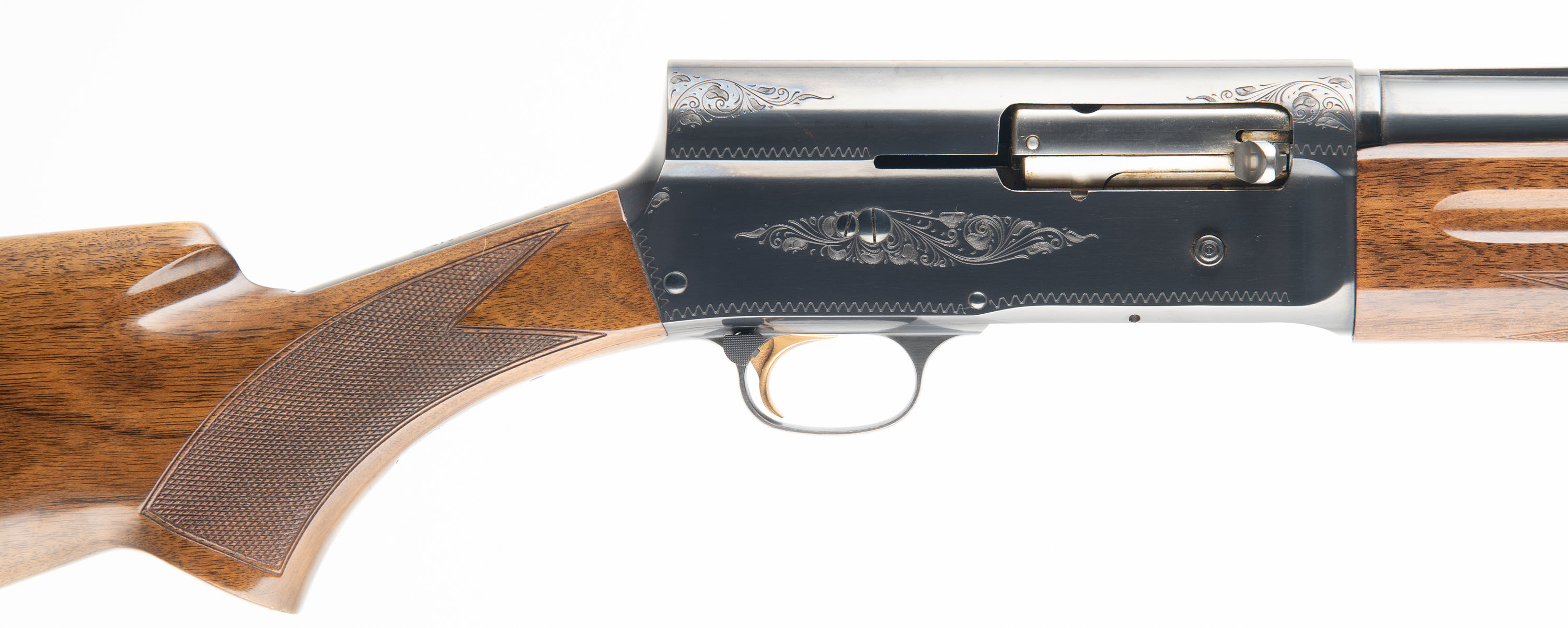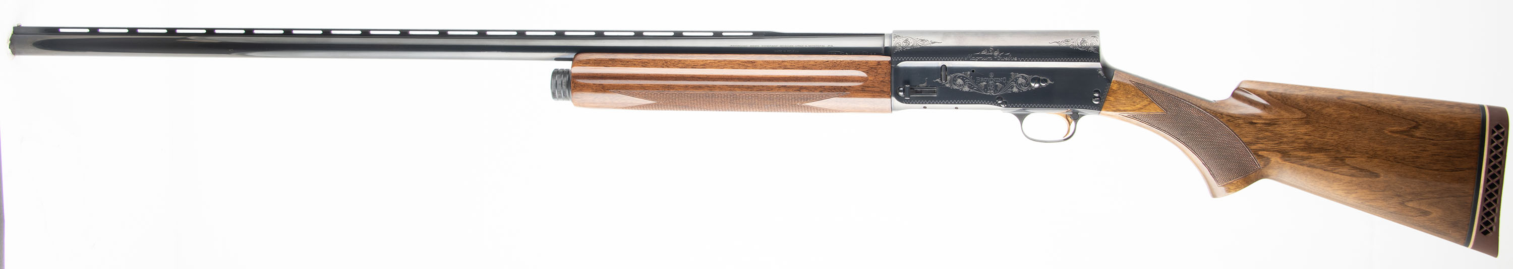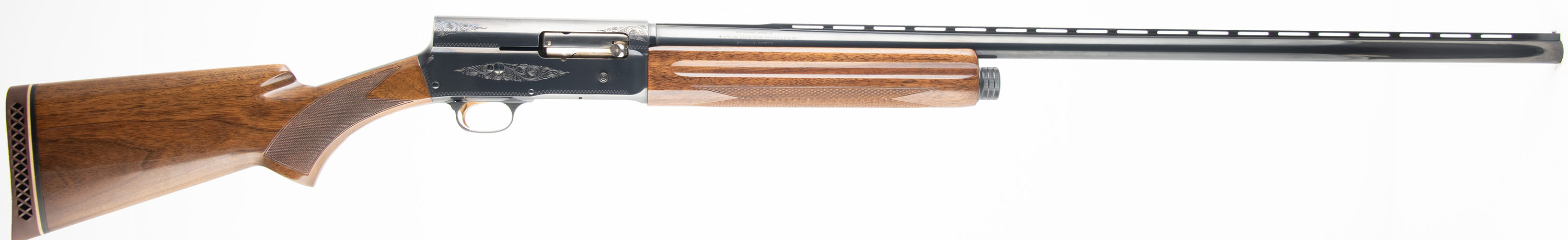 Browning (Belgium), Auto-5 Magnum Twelve, CAL; 12GA, MFG: 1974, SN: 74V29508, Semi Auto Shotgun, Choke: F, 3'' Chamber, 32'' barrel. Standard factory markings on the barrel alongside multiple proofs, marked ''MADE IN BELGIUM''. The receiver is marked ''MAGNUM TWELVE''. The full SN is marked on the bottom of the receiver. The original checkered flat pistol grip stocks are excellent. The high gloss finish is excellent. The original metal blue finish rates 97% overall. Bore is excellent. The ventilated rib holds a single front bead. Stock carries a Browning ventilated brown rubber recoil pad. LOP: 14 1/8'' overpad. FFL or C&R Req. - Value: 800 to 1400
