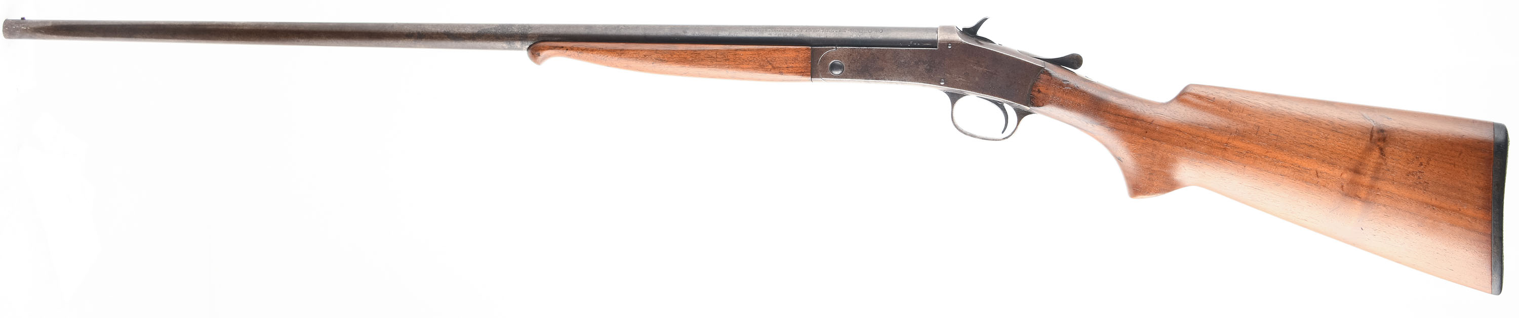 Winchester, Model 20, CAL: 410 GA, MFG: 1920-24, SN: 640, Tip Up Single Shot Shotgun, Choke: Full (Measures IM), 26'' Barrel. The wood stock is very good, solid with some handling wear, dings, scratches, and light edge chips. The blued finish on the gun has worn and toned to a mix of gun metal grey, brown patina, and original blue. Bore is fair, bright with substantial pitting near the chamber. Mechanically solid, seems to function well but is slightly stiff. The barrel holds a front bead sight, the frame has a rear sight notch cut into it. The stock has a checkered plastic Winchester buttplate. LOP is 13 1/4''. FFL or C&R Req. - Value: 200 to 500