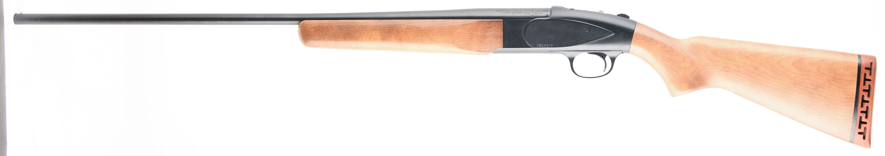 Westernfield (Montgomery Ward), Model SB-101B, CAL: 410 GA 3'', MFG: circa 1980's, SN: A210546, Tip Up Single Shot Shotgun, Choke: Marked ''Full'' (Measures IM), 26'' Barrel. The wood stock and forend are very good with minor handling wear, dings, and scratches. The black finish on the receiver is excellent with very light handling wear. The blued finish on the barrel has approximately 99% coverage with very light patina and wear. Bore is excellent, bright and smooth. Mechanically solid, seems to function well. The barrel holds a front bead sight. The stock has a rubber recoil pad. LOP is 12 1/2'' over pad. FFL Req. - Value: 100 to 250