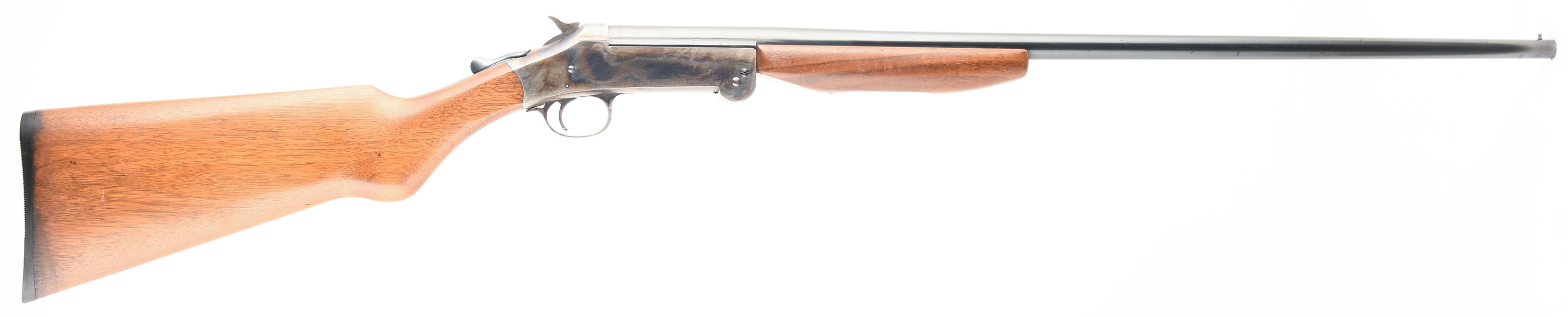 Ward's Westernfield, Model 21, CAL: 410 GA, MFG: circa 1930's, SN: F17582, Tip Up Single Shot Shotgun, Choke: Full, 26'' Barrel. The wood stock and forend are very good with minor handling wear, dings, and scratches. The butt of the stock has some water damage. The casehardened finish on the receiver is very good, the bottom is slightly faded. The blued finish on the barrel has approximately 98% coverage with very light patina, wear, and rust speckling. Bore is excellent, bright and smooth. Mechanically solid, seems to function well for the most part. The gun is stiff when closing and needs to be closed with some force. The barrel holds a front bead sight. The stock has a serrated plastic buttplate. LOP is 14 1/8''. FFL or C&R Req. - Value: 80 to 160