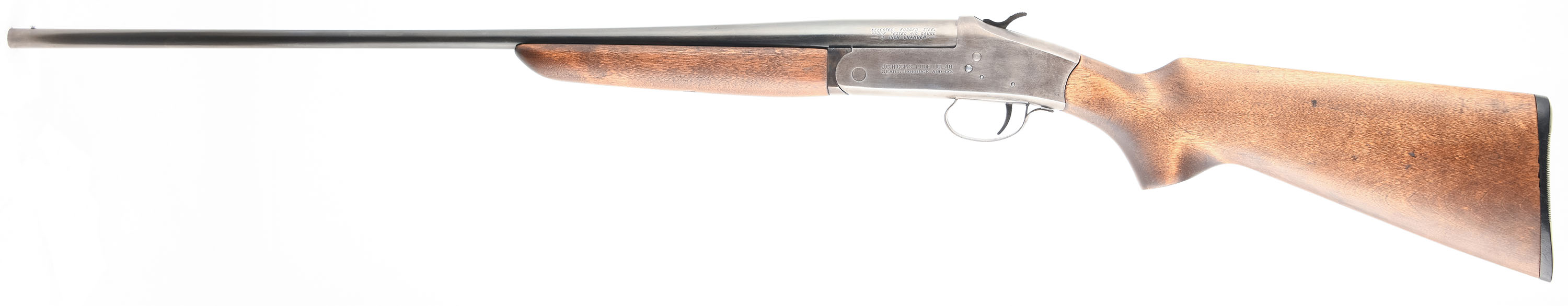 J.C. Higgins, Sears, Roebuck And Co., Model 101.40, CAL: 410 GA 3'', MFG: 1946-60, SN: None, Tip Up Single Shot Shotgun, Choke: Mod, 25 3/4'' Barrel. The wood stock and forend are very good, near excellent, solid with a couple of very small dings and scratches. High handling wear areas on the wood have darkened. The receiver has worn to a gun metal grey with light, even, speckled patina. The barrel has worn to a mix of gun metal grey and thin original blue with some areas being toned to a light brown patina. Bore is excellent, bright and smooth. Mechanically solid, seems to function well. The barrel holds a front bead sight, there is a rear sight notch cut into the top of the receiver. The stock has a serrated plastic buttplate. LOP is 14''. FFL or C&R Req. - Value: 150 to 300