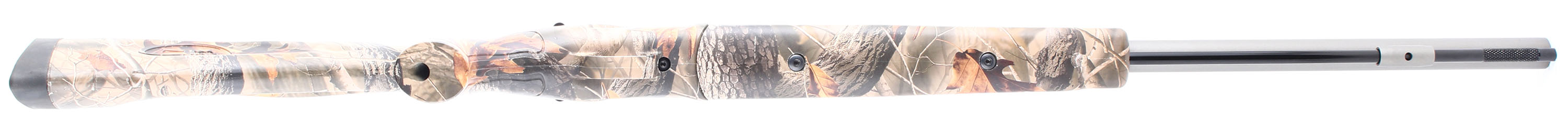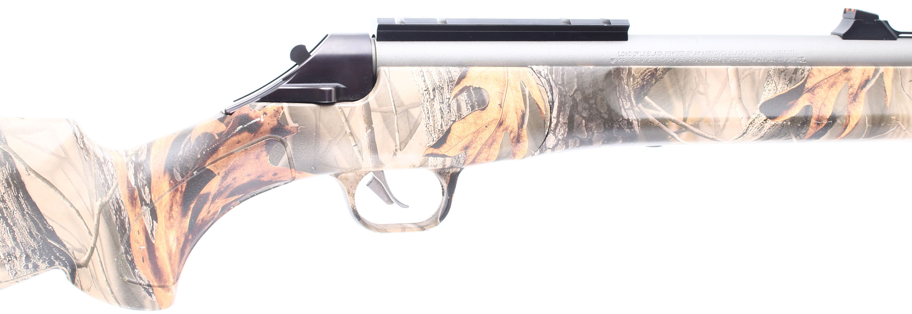 Thompson Center Arms, T/C Impact, CAL: 50, MFG: Modern, SN: VCW2608, Percussion Muzzleloader Rifle, 26'' barrel. The synthetic & ergonomic Monte Carlo stock is excellent. The REALTREE Hardwood camo finish is excellent, with minor handling marks & chips. The satin stainless finish on the barrel is very good, with handling marks & the pull back action rates 95%, toning plum. Bore is excellent. Fiber optic sights. Integral sling studs. Ramrod present. Missing screw-in breech plug. Mechanical operation appears to function properly. Muzzleloader, No FFL Req. - Value: 150 to 300