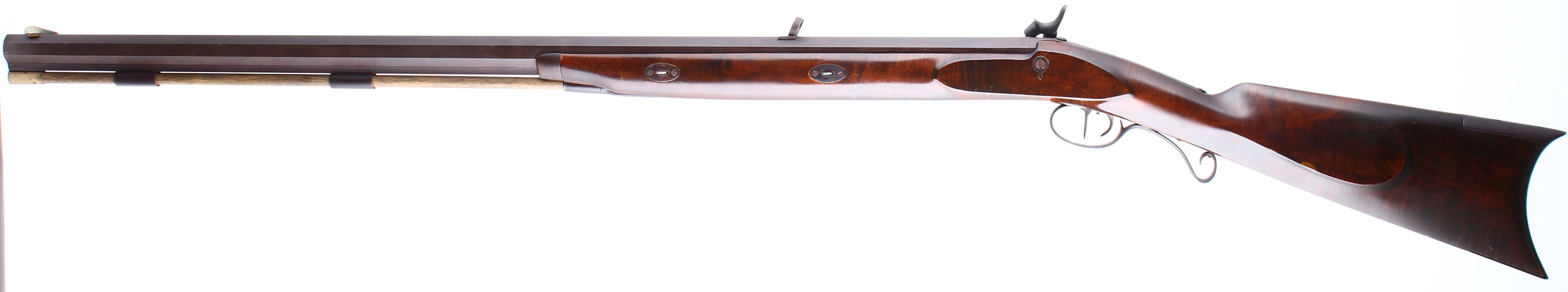 S. Hawken, Hawken Rifle, CAL: 54, MFG: Modern, SN: NONE, Percussion Muzzleloader, 34 3/4'' octagon barrel. The cheeked straight grip wood stock is excellent. There are light scrapes & blemishes to the high gloss finish. The browned finish on all metal components is excellent, with full coverage. Bore is excellent. Buckhorn rear sight & blade front sight. Crescent metal buttplate. Double set triggers. Ramrod present. Mechanical operation appears to function properly. Blackpowder, No FFL Req. - Value: 300 to 600