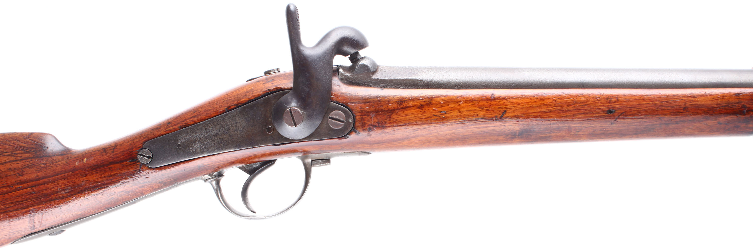 HISTORY: This rifle started life as MLE 1822 .69 Caliber (17.5mm) smooth bore flintlock musket. After France adopted the MLE 1840 which switched from a flintlock Charleville style action to the percussion ''Back Action''. France would in turn start converting older flintlocks with the new Percussion system, converted rifles are noted by having a ''T'' for Transformed added to the model on the gun. These systems were all .69 Caliber smooth bores. In 1846, French Military Instructor & Inventor Claude-Etienne Minie would invent the Minie Ball Which allowed Rifles to be loaded as quickly as smoothbore musket, but retain their rifle accuracy. France would later issue their first Rifled musket for the mainline infantry the MLE 1857 & the older smoothbores were rifled, making their bores 18mm, these would be marked 18mm & have a T added onto it model. Frane went through many small updates & changes during this time with their muskets & rifles so there are a lot of small variations of markings & style from surviving guns. Large numbers of these French muskets were imported just before & during the civil war for both the Union & Confederacy. People had mixed opinions on them because the rifles were a mix of perfectly fine rifles, & some which were unsafe to shoot. France was starting to switch to a breech loading rifle at this point so saw the Civil war as the perfect opportunity to off load all their unwanted older muskets, leading to them being in different states of disrepair, some being smoothbores, some being converted rifles, some older flintlocks, & converted percussion guns. France would later convert many of their muzzleloaders to a breech loader with the Tabatieres system. These would see use with France during the France Prussian war of 1870 alongside the MLE 1866 Chassepot. Many of these were converted to shotguns mostly in Belgium but some were done in France, & then sold on the US market around 1880's-1900 as cheap trade shotguns usually under the name ''ZULU'' or ''HUNTER''. This rifle here appears to be a Mle 1840 that was later bored with rifling, but the barrel & barrel tang markings are illegible.