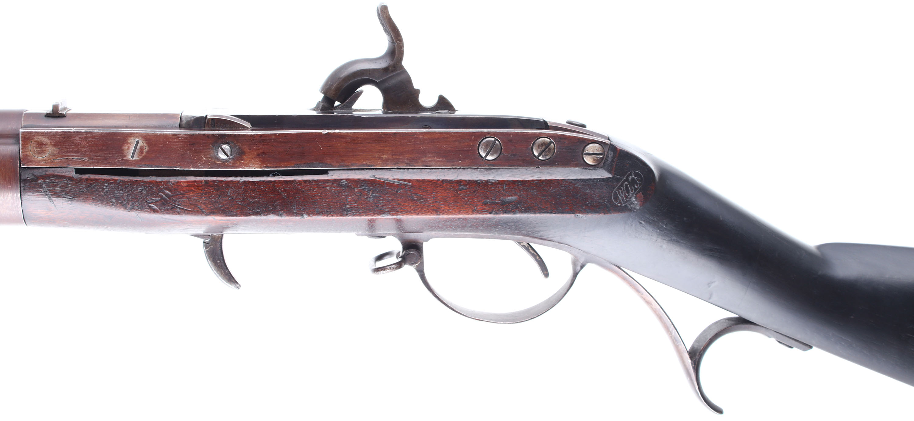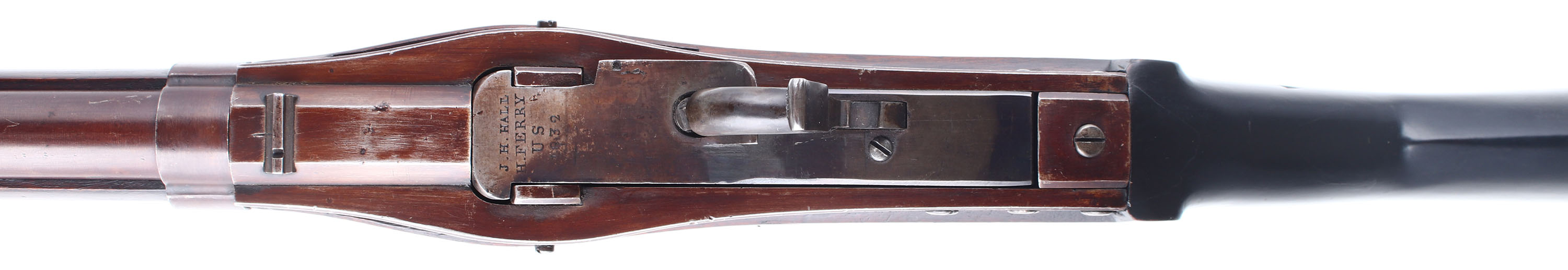 HISTORY: Designed by John Hancock Hall. The Hall rifle was the first breech-loading rifle to be adopted in large numbers by any nation's army. Instead of having to load from the muzzle, the chamber can pivot up & you can load your ball & powder from there. This made reloading faster in general & since you did push the bullet through rifling to load, being rifled or smooth bore did not affect reloading speed. The army conducted tests & found it was more accurate than their rifles & reloaded faster than the smoothbores. Carbines were produced starting in 1833, these had smooth bore barrels & were the first Percussion arm adopted by the US. New rifles would be produced with the percussion lock & older rifles would be retrofitted. The rifles would see updates through the years until production stopped in 1844. These were used in US conflicts up till the civil war, basically they were used until they wore out. Some were sold to Argentina when the US started replacing them with sharps & The Buenos Aires State Forces would use them in small numbers clear until 1881. Thousands of rifles were made, though the troops and many leaders preferred the simplicity and lower costs of muzzle-loaded weapons, but the advantages were clear, & its influence paved the way to new breech loading designs. John Hall built his own shop (Hall rifle works) & machines at Virginius Island on the Shenandoah River, just around the corner from Harpers Ferry located on the Potomac River. He built the rifles with the brand-new concept of interchangeable parts & would pioneer the concept for the whole world. Hall was able to start producing the rifles at his factory starting in 1824 & would receive a contract for 1,000 rifles. He would quickly get another contract for 1000 as the rifles from the other order were being delivered. The need for the rifles would soon outgrow Halls factory & Simeon Noeth of Middletown CT would get a contract for Hall rifles, but the parts had to be completely interchangeable with the Harpers Ferry guns. He was able to achieve this & started making rifles in 1830. North would end production with Hall carbines in 1853. This was the first time in history that rifles from two different manufacturers had completely interchangeable parts. between the two manufactures about 50,000 hall rifles & carbines were produced.