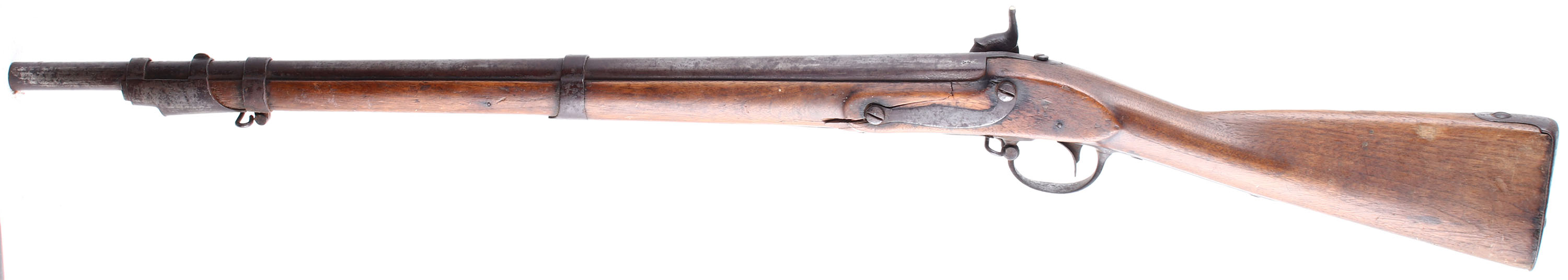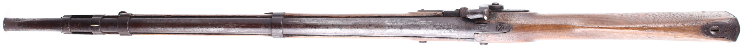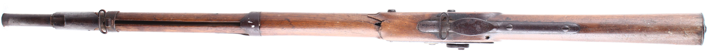 HISTORY: The M1822 Musket was a continuation of the M1816 musket, sometimes referred to as the M1816 type II, or sometimes still referred to as the M1816 in older documents. The Biggest change from the M1816 is the attachment of the rear sling swivel, now attached to the trigger guard & not a stud on the trigger guard tang. Lots of these rifles would be converted to percussion & rifles by both the military & by civilians after they were surplused. Converted M1822 & original smoothbore flintlocks were used on both sides of the civil war, mainly during the beginning when percussion rifles were in short supply. Most of these would stay as smoothbore because most of the barrels were too thin to be bored with rifling & still be strong enough to contain the blast. The later M1840, still a smoothbore flintlock, was made with thicker barrel in anticipation of rifling them later, these were the majority of the smoothbores that were converted to rifles. After the civil war the Government was quick to sell off their obsolete muzzleloaders & begin upgrading them with metallic cartridge breechloaders, flooding the market with cheap surplus guns. Many were bought up cheap & converted to fit the use of the owner. This musket has a after marked replaced hammer & been cutdown into a short rifle with the military hardware moved back on the stock.