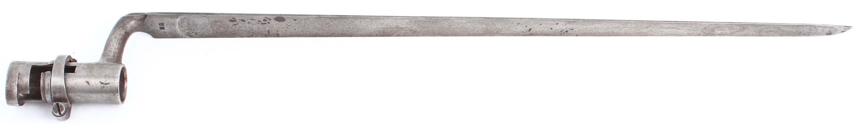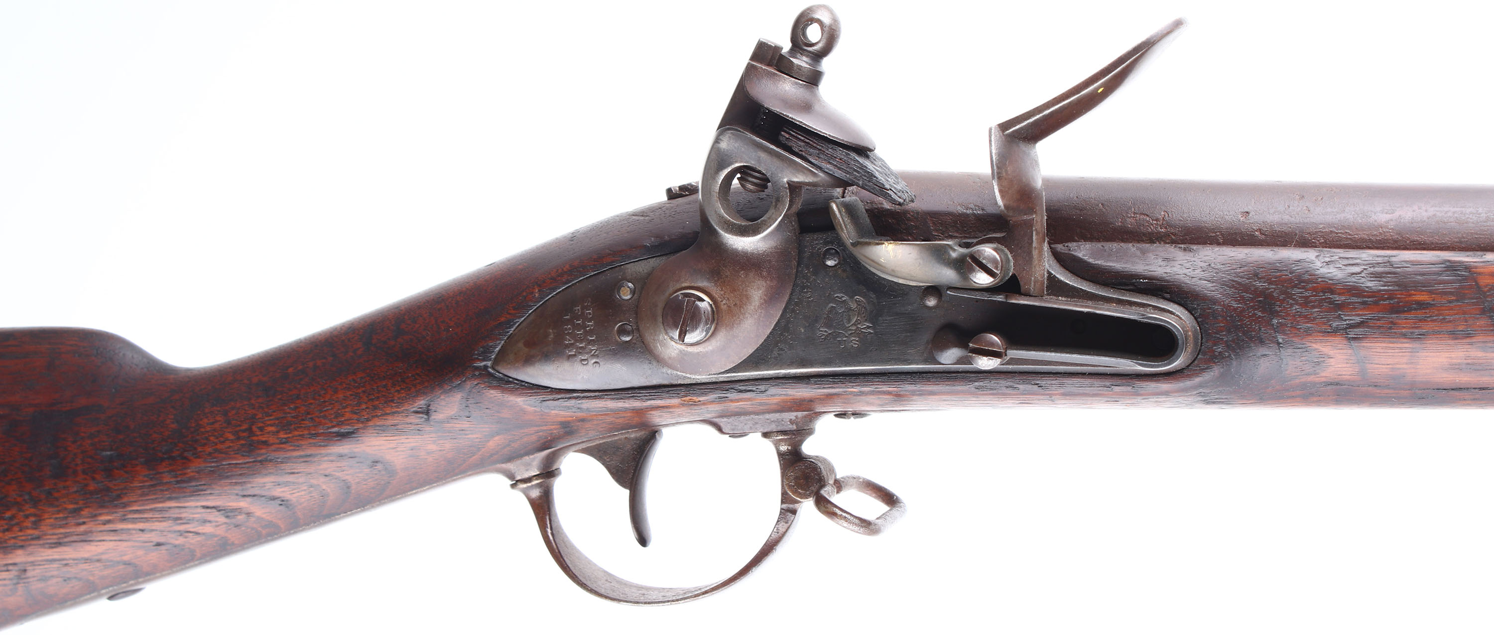 CONDITION: The straight wrist black walnut stock is very good with no visible cracks, but has some nicks, dings, scuff, & scratches from use/age. One gouge spot on the forend between rear & middle barrel bands, by the ramrod channel. Stock has darkened from added oils over time; wood has also shrunk/worn over time leaving the metal proud to the wood around the toe & slightly around the lower wrist tang. The left flat of the stock is marked with two inspectors' initial cartouches, ''JM'', ''TW'', for Justin Murphy & Thomas Warner respectively. The ''TW'' cartouche is almost illegible, but still present. The left cheek of the stock appears to be hand carved ''KAM'', marking is old & worn. the right cheek has another hand carved word; marking is heavily worn & partially illegible. The barrel has toned to a brown patina with spots of gun metal gray, has roughness across the metal & spots of light pitting near the action & stock line. Remains of a case-hardened finish on the lock that was re-done at some point with roughness & buffed markings, could be either arsenal or civilian done. There is a brown protective finish/lacquer on the trigger guard & lower tang. The barrel & barrel tang have no visible markings. The lock is marked ''SPRING'' over ''FIELD'', over ''1841'', & a American great eagle. Upper extension of buttplate marked ''US''. The bore is Poor. Dark with rust, roughness & pitting. The front barrel band holds a brass front sight. The stock carries a iron buttplate, toned to a brown patina with light roughness. The musket has both sling loops & the iron ramrod. Musket also comes with the correct socket bayonet, bear metal & marked ''US'' on the blade. Mechanical function appears fine. Solid audible clicks into half & full-cock, trigger drops hammer freely with no binding. A rare & interesting transitional musket right when the US was switching to percussion. Antique/Muzzleloader, No FFL Req. - Value: 2000 to 6000