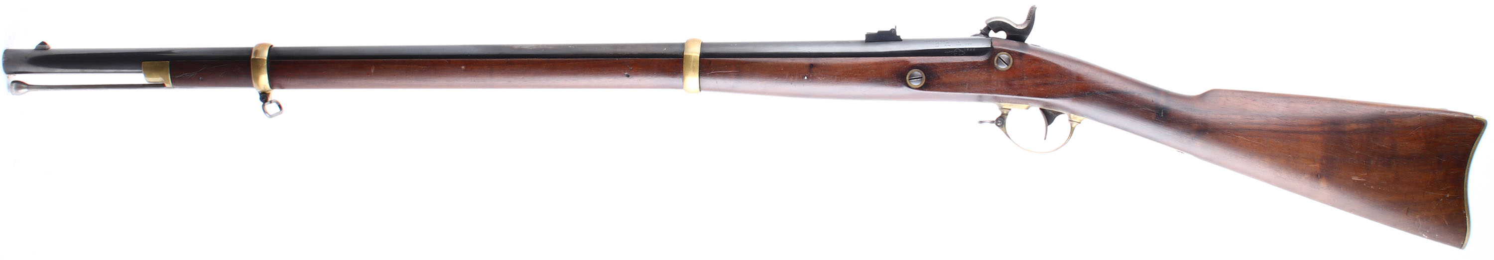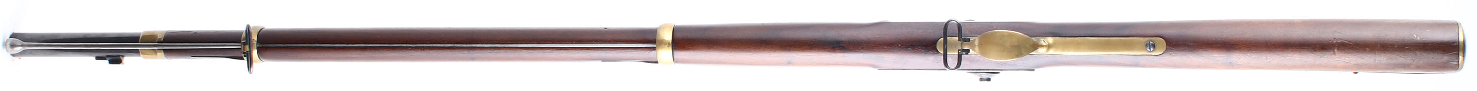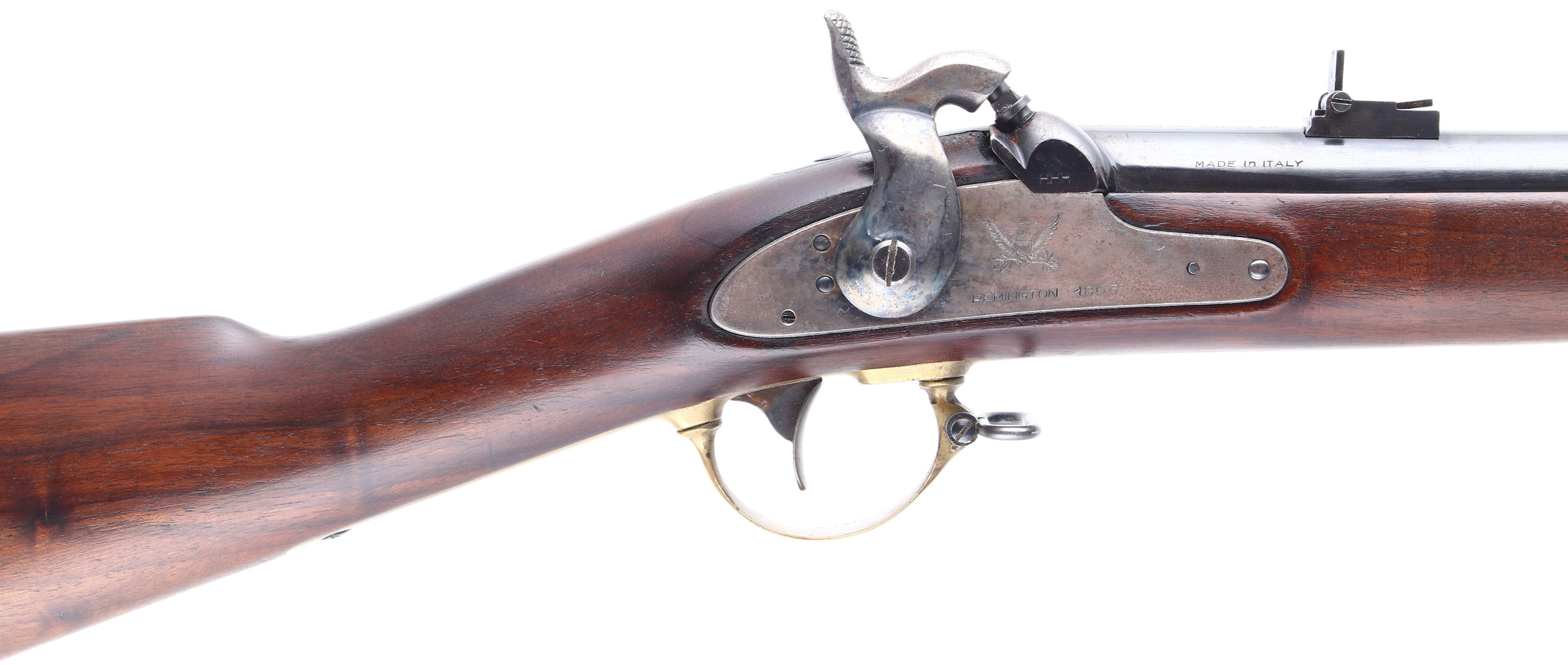 CONDITION: The straight wrist walnut stock is very good near excellent with light nicks. dings, & scratches from use/age. Brass patch box in right cheek of stock. The barrel has been re-blued leaving some markings faded. Blue rates 87% with thinning starting to tone brown by the action & between both barrel bands. The lock has thinned remnants of a case-hardened finish around the hammer. The rear of the barrel is marked with the S/N, Italian Proofs, the Hy. Hunters address stamp & ''MADE IN ITALY''. Lock plate marked with a American great eagle & ''REMINGTON 1863''. The bore is Excellent. Bright & shiny with minor wear from light use. Three-groove rifling. The barrel holds a barleycorn front sight with a three-leaf U-notch rear sight. The stock carries a brass buttplate, has light patina. The rifle has both sling loops & a metal ramrod. Hammer locks in half & full cock, trigger will release hammer in half-cock. Muzzleloader, No FFL Req. - Value: 250 to 500