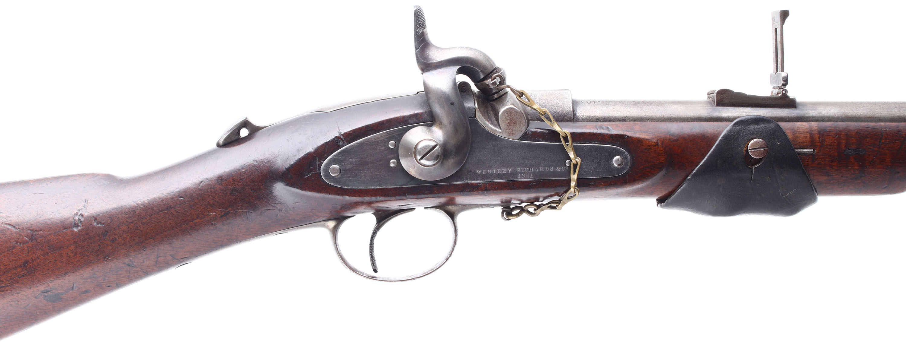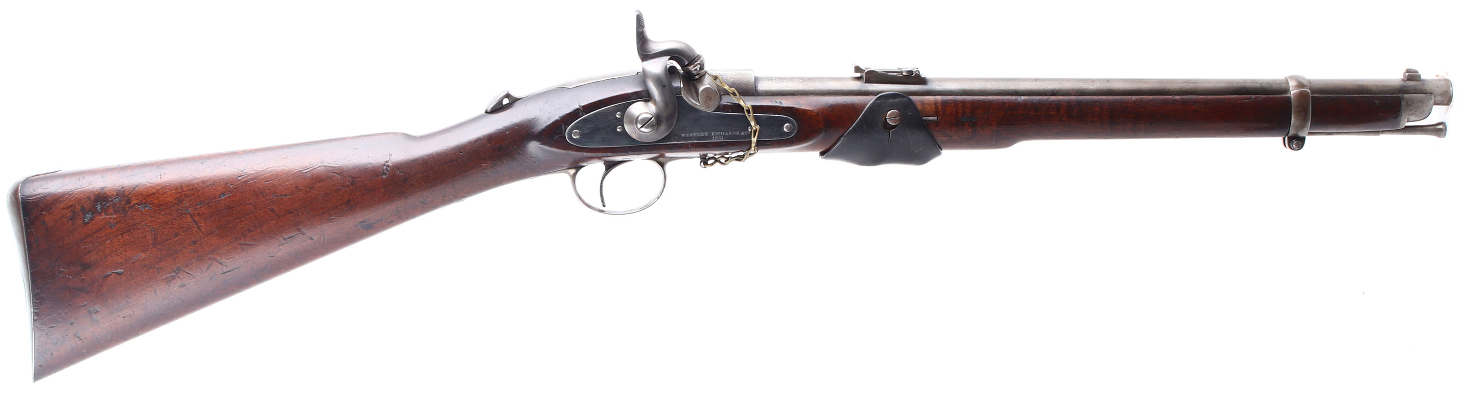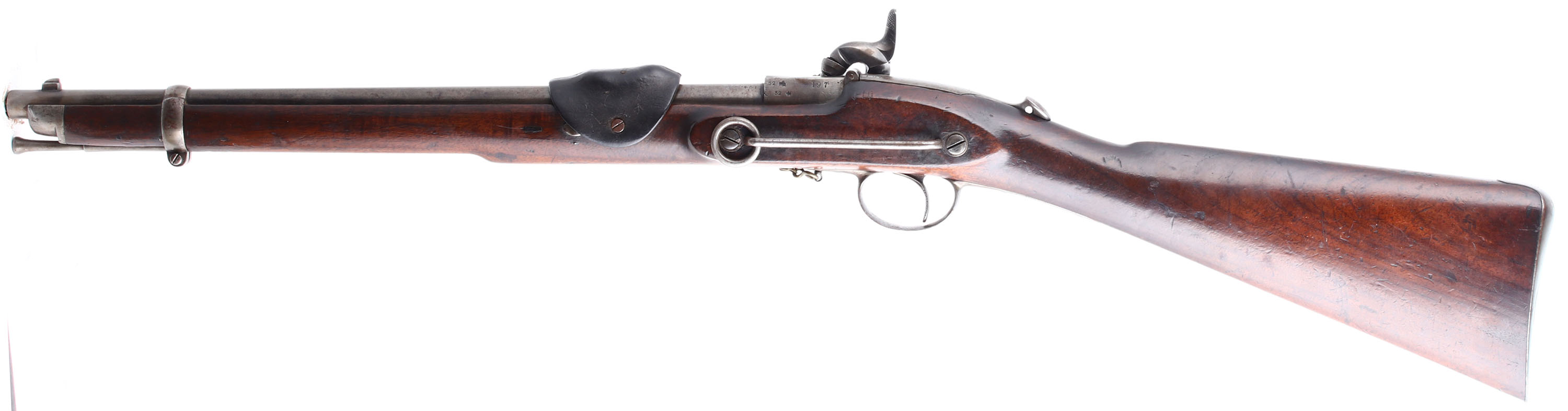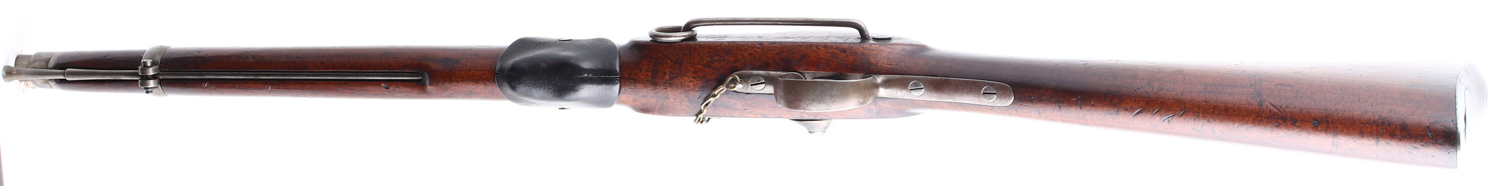 HISTORY: This is one of 60 Monkey tail carbines ordered by the 8th Duke of Bedford in 1861 to arm the Royal Gloucester Hussars. They were issued 6 per troop & 12 per Squadron. Only the best shots were given the carbines to put them to their best use, soldiers would compete with each other with their older muzzle-loaders to see who got the carbines. The units with carbines were always placed on the outer part of the squadron/ troop formation & acted as skirmishers. In March of 1871 the whole regiment was outfitted with monkey tail carbines, & they were to be replaced in 1880 with Snider Carbines.