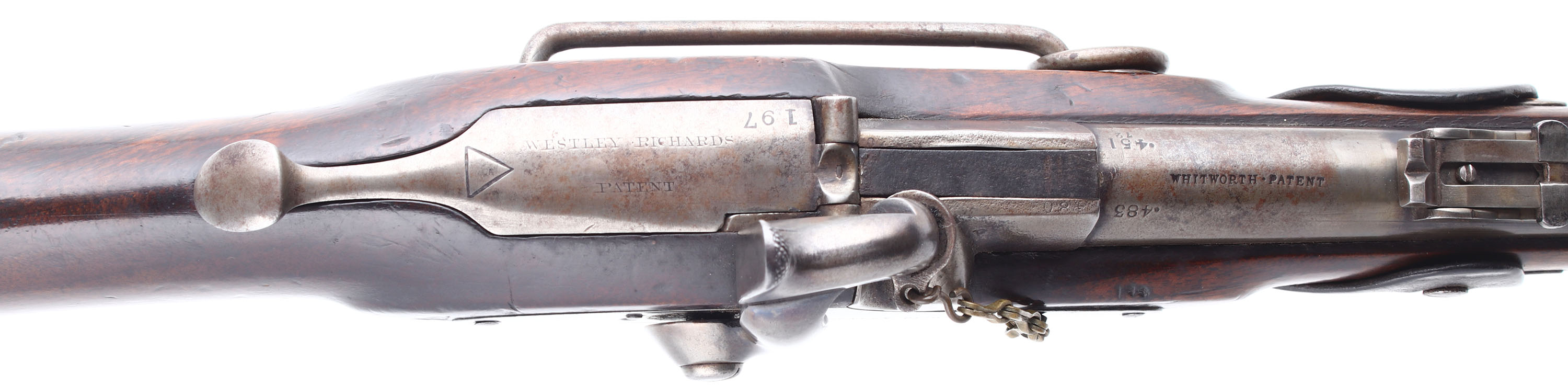 CONDITION: The straight wrist walnut stock is very good with various nicks, dings, dents, & scratches from use/age. Wood has added oils on it over time. Wood has slightly shrunk from time & the buttplate is slightly proud to the wood at the toe & upper extension of the buttplate. The bottom of the wrist, just below the lower tang, has a faint ''197'' stamp (S/N). The metal has toned to a mix of gun metal gray & light brown patina with spots of thinned blue remining in spots along the stock line, front/rear sight, & protected areas. The lock plate has a arsenal re-blue & rates 90% with some thinking, has light roughness in spots under finish. Most markings are worn/faded from wear & age. The barrel is marked ''.451'' over ''72'' on the left, ''WHITWORTH PATENT'' at the top, & ''.483'' on the right. Just ahead of the rear sight on the barrel is a heavily faded marking, worn illegible, only faint outline remains. The left side of the chamber is marked with two ''52'' bore (gauge), bore measurement, three British proofs, the S/N, & a small ''OO'' over ''S'' stamp. The top of the chamber is marked ''480'' & ''O''. The right side of the chamber is marked ''P''. The top of the breech cover is marked ''WESTLEY RICHARDS '' over ''PATENT'', & the S/N. The lock plate is marked ''WESTLEY RICHARDS & CO.'' over ''1861''. The upper extension of the buttplate is marked ''RGH.44'', this is for the Royal Gloucester Hussars rifle No.44. The bore is very good. bright & shiny with some roughness throughout the bore. The barrel holds a barleycorn front sight with a stepped base/ flip up ladder, V-notch rear sight. Base I marked 2 to 4, ladder marked 1 to 8. Rear sight has the leather cover, has two cracks at the top & slightly stiff, still can swing up & cover the sight. The stock carries a steel trapdoor buttplate that's toning to a brown patina, nothing inside trapdoor. Left side mounted sling bar & ring. Rifle has the correct cleaning/clearing/ram rod, & nipple protector on chain. Antique, No FFL Req. - Value: 2000 to 6000