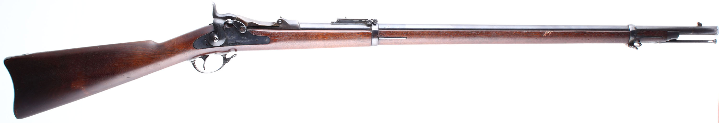 CONDITION: The straight wrist American black walnut stock is very good near excellent, but has some nicks, dings, & scratches. stock has added oil/finish. Metal to wood fitment is solid & the wood doesn't appear to have been sanded or seen heavy wear. Left side of the wrist stamped ''SWP'' over ''1889'' in a box inspector/acceptance cartouche. Metal has been re-blued/re-finished. The blued finish on the barrel rates 92% with spots of light thinning, light scratches & wear at the muzzle. The blued finish on the receiver rates 90% with spots of light thinning & some roughness under the finish. The breech block & rear barrel tang retain faded case-hardened finish with spots toning brown. The inside of the breech block retains deep case-hardened finish. The lock plate has full blue coverage with spots of thinning. The top of the breech block is marked ''US'', ''MODEL'', ''1884''. The rear of the receiver is stamped with the S/N, stamp is faded. The chamber is marked V over ''P'' over a eagles head, ''P'', ''A'', some marking slightly faded from re-blue job. The lock plate is marked with a American Great eagle stamp, ''U.S.'', ''SPRINGFIELD'', markings are slightly faded from re-blue. Upper extension of the buttplate marked US''. Both barrel bands marked ''U''. Oval knurling on hammer, serrated trigger, & has the ''three-click'' action. The bore is excellent. Bright & Mirror like with little visible wear. The barrel holds a small blade front sight with a Buffington, U-notch ladder rear sight. The stock carries a blued steel buttplate, mix of gun metal gray & blue. The rifle has both bottom sling swivels & the third stacking swivel. The rifle has the cleaning/clearing rod. Antique, No FFL Req - Value: 700 to 1400