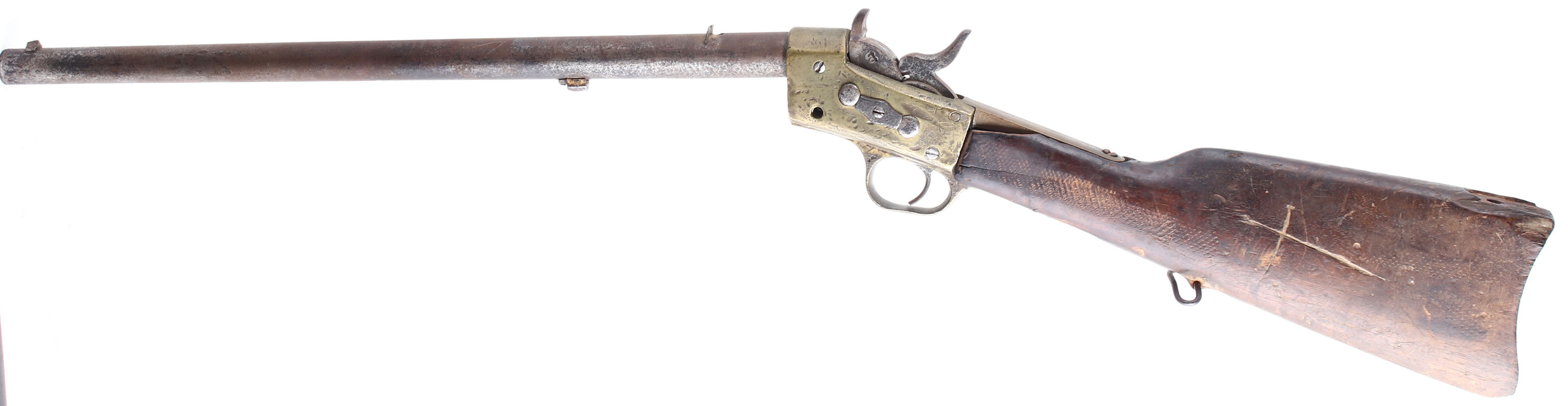 CONDITION: The straight wrist buttstock is fair to poor. Has cracks, chips, scratches, vice marks, dings, & wear from use/age. Missing forend. The barrel has toned to a mixture of gun metal gray & brown patina. the Brass frame has patina & numerus nick & ding marks. Crack in the rear top screw hole on the right side of the receiver along the top of the frame. Frame missing the forward receiver tang. Breech block is stuck forward, does have some play but wont mechanically open. Hammer is seized, does have some play but wont lock back. Forend/barrel lug is loose. The receiver band is marked ''N.L.P.''. The bore is Poor. Dark with pitting. The barrel holds a barleycorn front sight with a fixed U-notch rear. Buttstock has no buttplate. The rifle has a rear sling mount, loop is bent. This rifle is being sold AS IS with NO RETURNES ACCEPTED. Antique, No FFL Req - Value: 100 to 600