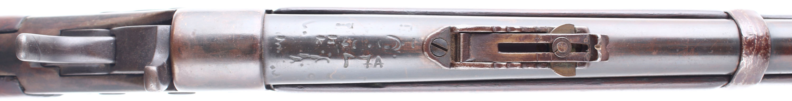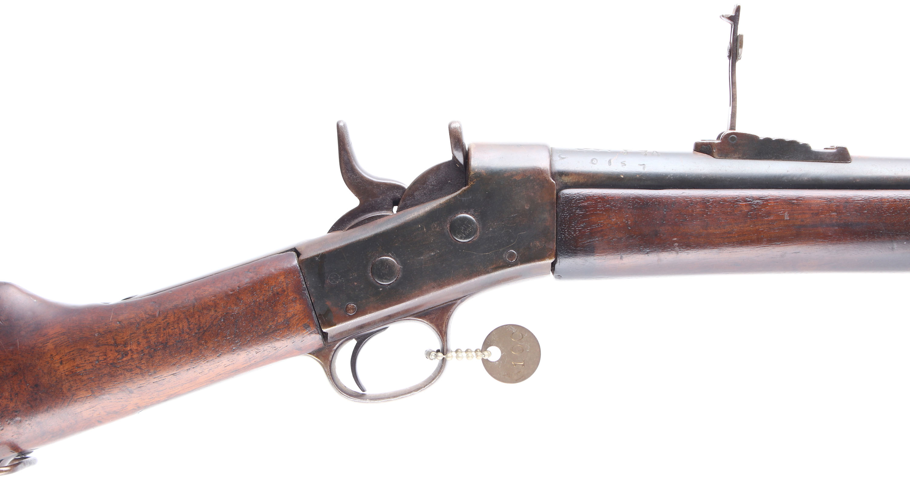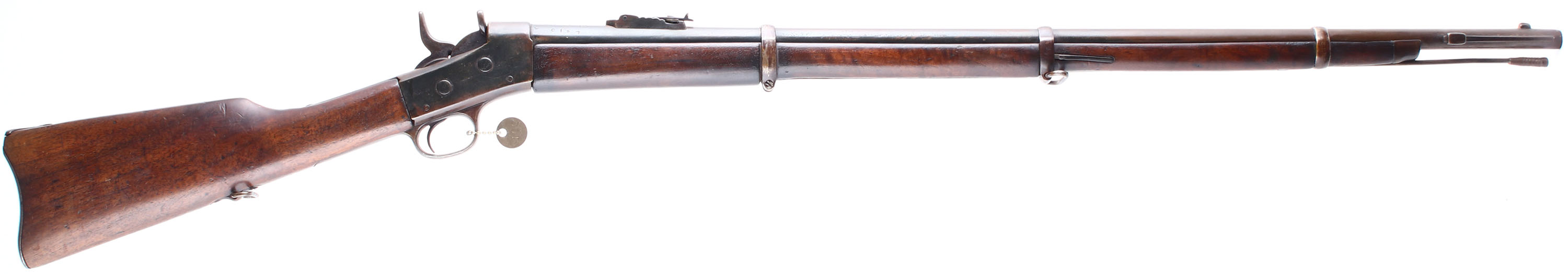 CONDITION: The two-piece straight wrist walnut stock is good. stock has been worn down in spots from time & use. Stock has added layers of oil/finish. 1 1/2'' chip repair on the bottom left of the wrist. The Metal has a old re-blue. The blued metal finish rates 35% overall with most areas toned to a brown patina. A few spots of light roughness dotted around the metal. The upper tang Remington address is mostly worn away with faint remains on the bottom right of the stamping. The left side of the chamber is stamped ''H'', partially faded. The top of the chamber is marked with many Arabic markings. The bore is fair. It is bright but has some roughness, worn rifling & the rifling at the muzzle has worn smooth. The barrel holds a worn barleycorn front sight with a stepped base/ladder V-notch rear sight. Base range markings worn away, only visible marking on ladder is the 6. Replaced ladder spring. The stock carries a steel buttplate, has brown patina, rust & light roughness. The buttplate edge over the Heel of stock has been worn through showing wood. The rifle has both bottom sling loops & the cleaning/clearing rod. rifle has a brass hangtag on the trigger guard marked ''100''. This rifle shows heavy use wear of a long time, likely almost 100 years of service/use. Only if this rifle could tell the stories of what it saw. Antique, No FFL Req - Value: 400 to 800