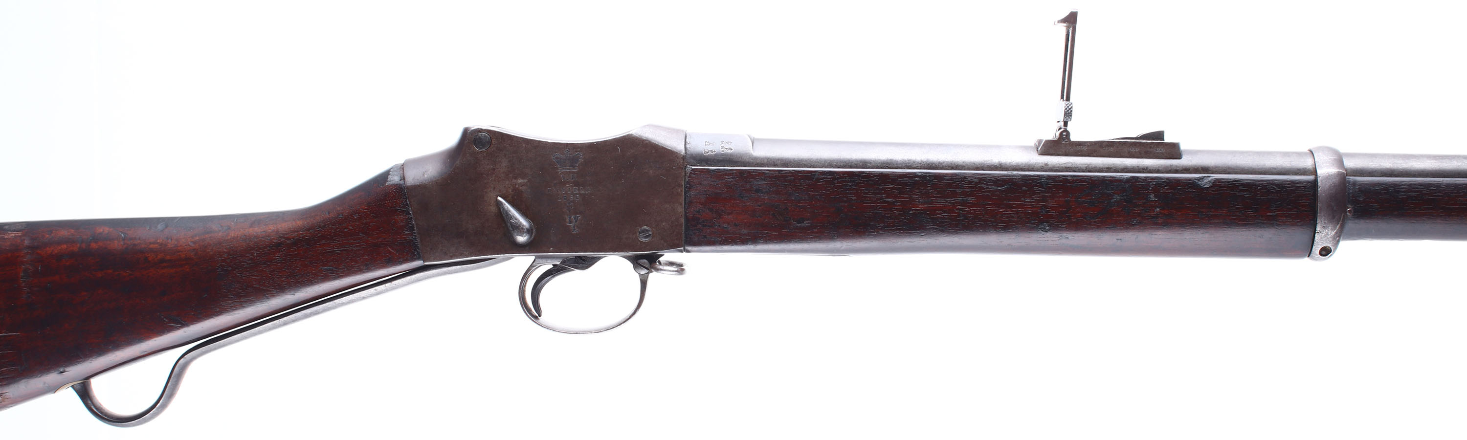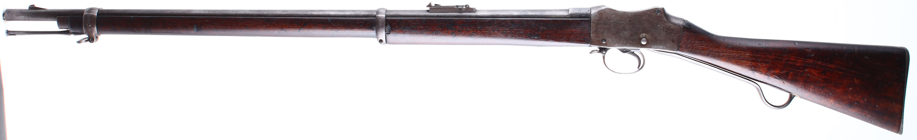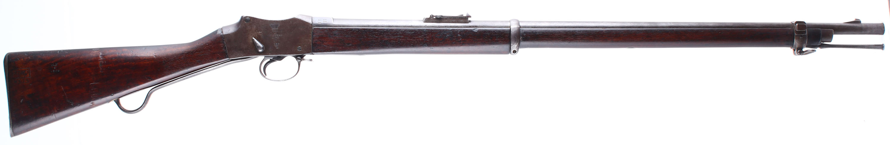 HISTORY: The Mark IV Martini-Henry came to be from the British experimenting with the .402 Enfield-Martinis. However Britian would decide to go with the .303 Lee-Metford magazine rifle, instead of pursuing the .402 Martini which left large numbers of odd caliber guns in British hands. The Older .455 Cal Martini-henrys were still in wide service so Britian chose to converted the .402 Martini-Enfields into .455 Martini-Henrys by re-barreling them & using the Martini-Enfield parts, making the MK IV Martini-Henry. The mark IV brings the most changes to the design, most notable the operation lever was lengthened by 5 inches, & the receiver was rounded, cut down and sloped at the back to improve the grip of the rifle. There were three variants of the Mark IV produced, denoted A, B, & C. The A & B variants are conversions of the original .402 Martini-Enfields. The C Variant was made from either a mix of new & old parts, or entirely of new production parts just for the Mk. IV not the .402 Martini-Enfield. B & C Variants also have a distinct ramp style front sight, while the A variant & older Martini-Henry models have a barleycorn front sight. Approximately 100,000 Mk IV rifles were made, all being made/converted at Enfield between 1887-89. This rifle sold & used by Nepal & bears the Marking in Nepalese ''Chandra'', for Field-Marshal Maharaja Sri Teen Sir Chandra Shamsher Jang Bahadur Rana, the prime minister of Nepal from 1901 to 1929, showing it was bought during his time. It also bears the markings showing it was decommissioned at the Rawalpindi Arsenal in Pakistan & sold to Nepal in 1908, lining up with the other marking.