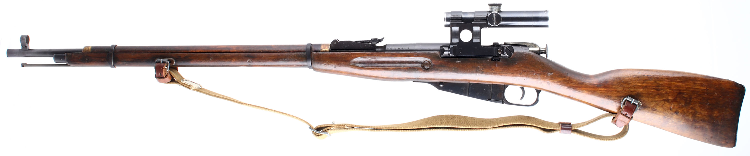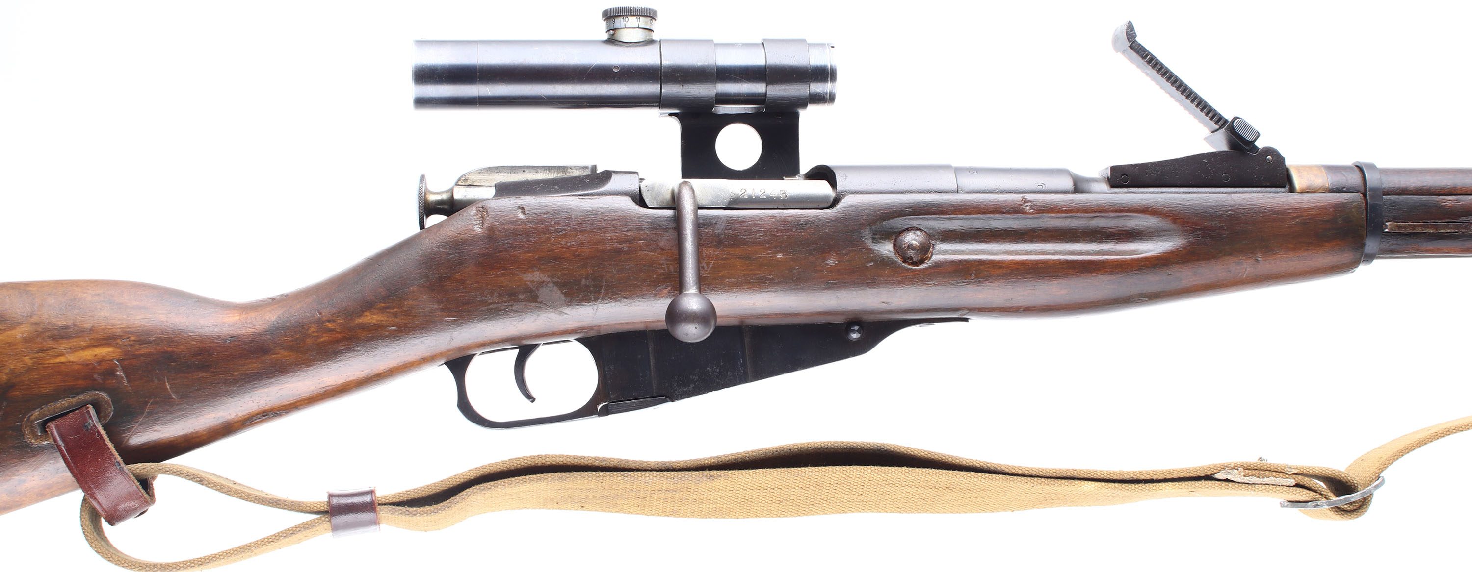 Izhevsk, M91/30 PU Mosin, Cal: 7.62x54mmR, MFG: 1944, S/N: 21243, Bolt action rifle, 29'' barrel. The straight wrist wood stock is good with various nicks, dings, dents, chips, & scratches from use/age. A stock lacquer has been added over the wood. Faint roundel cartouche on right cheek of stock. Metal parts in the stock like the recoil lug, forend cap, & sling well escutcheons have some rust & roughness. The metal carries a arsenal refinish & rates 90% overall with almost full coverage, just has spots of wear/thinning. metal has roughness/pitting scars under the finish & many markings have been worn/buffed away. The barrel shank is marked with the scope S/N ''44 1 4888'', a arsenal refurbishment diamond marking, the S/N and many faded proofs, the ''1944r'' marking is mostly gone with just the edges barely visible. The Izhevsk markings are gone off the barrel shank. The S/N appears to have been restamped as it would have been obliterated with the other markings. the underside of the receiver tang marked ''1944'' & with the Izhevsk arrow in triangle logo. No visible import markings. S/N matching bolt & buttplate, mismatched magazine floor plate. bolt body & its components marked ''02'' for Hungarian MFG at FEG in Budapest, indicating this might be a Hungarian rebuilt M91/30 PU. The bore is good to fair. It has strong rifling but with roughness throughout the bore & is beginning to darken. The barrel holds a post front sight with protective globe (loose in dovetail), U-notch leaf rear sight marked 1 to 20. The receiver has the Kochetov mount, PU scope rings, & PU scope mounted. PU scope rings are marked two faded Russian proofs. PU scope is a factory 237 NKV (Kazan) MFG & is number ''4417179'' (does not match rifle). They made PU scopes in 1943-44, & the majority were the SVT tube PU scopes, only a few thousand Mosin Tube PU scopes were made just before production ended in 1944. Total scope production for them would be less than 40,000. The stock carries a blued steel buttplate marked with the S/N on the upper extension. Roughness under the finish & light finish wear on edges. The stock has both sling wells & has a period correct Canvas sling with the leather ''dog collars''. Rifle also has a cleaning rod. A possible Hungarian Rebuilt PU Mosin that shows here honest wear & scars. FFL or C&R Req. - Value: 600 to 1400