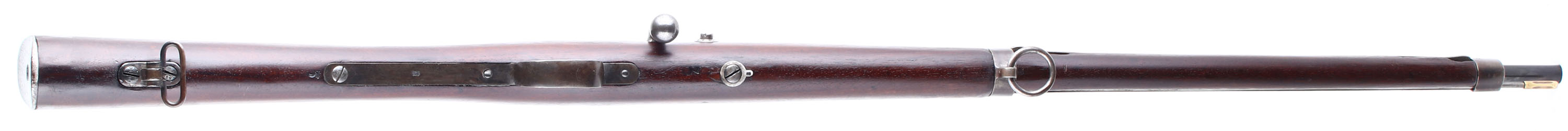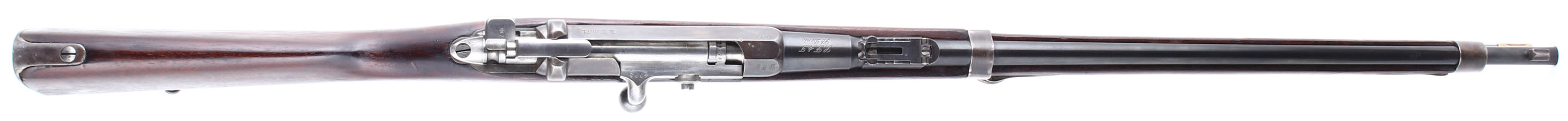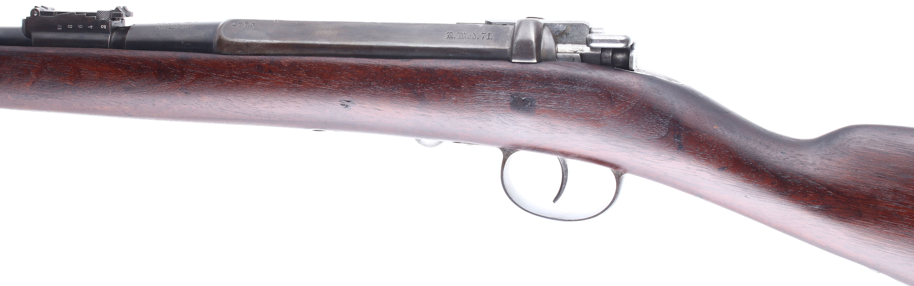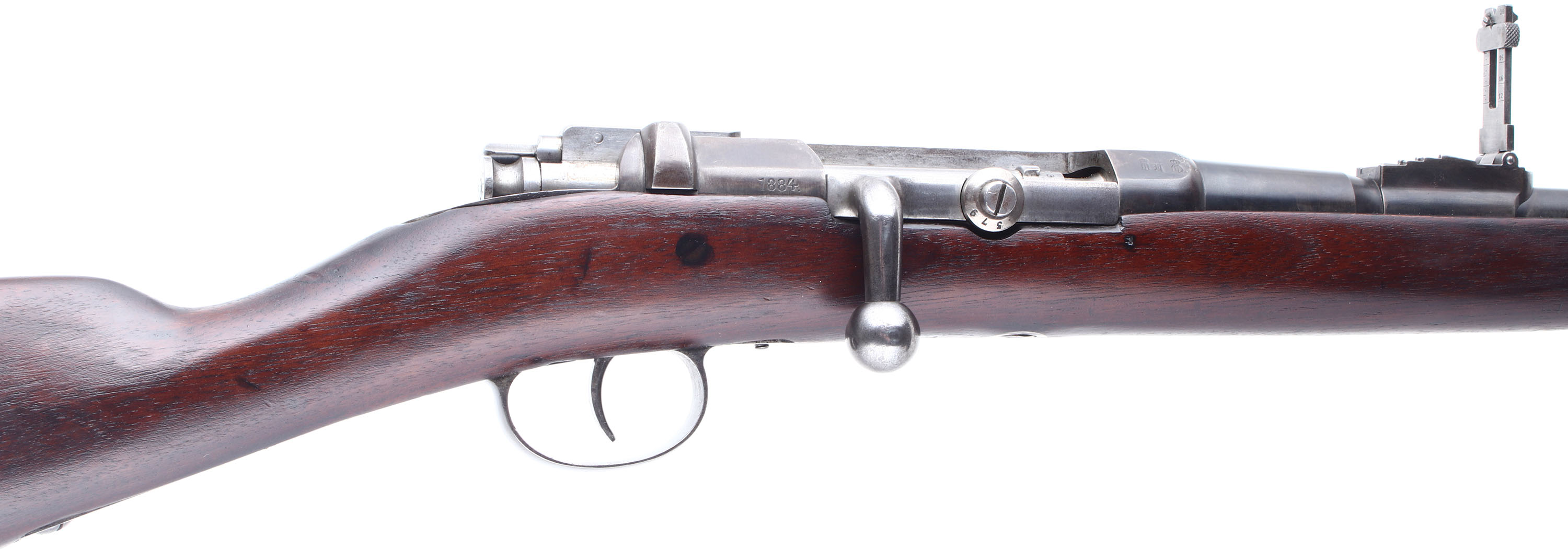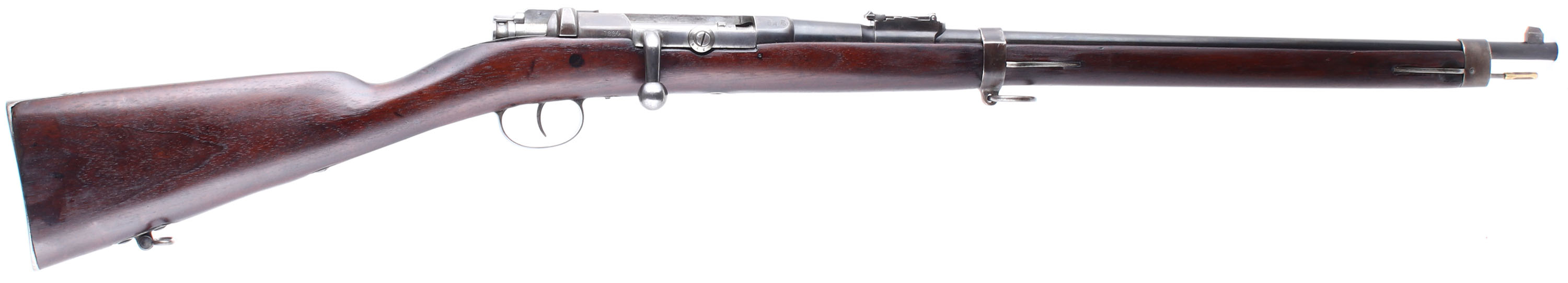 CONDITION: The straight wrist wood stock is very good as having a wrist break repair & being lightly sanded & refinish because of the break. The wrist repair is tight & has four wooden dowel reinforcement. One small chip repair on the stock/receiver bolt escutcheon, on the bottom of the stock. The stock also has a couple wood fill repairs dotted around the stock. The repairs & re-finish job is professional & appears to have been done in a arsenal, likely when it was converted at St. Denis. Light oil staining around buttplate. the bottom of the stock has two worn ''3'' stamps, one just in front of the trigger guard tang, one just behind. The blued metal finish on the barrel rates 94% with some spots of light thinning, mostly around chamber. The receiver was left in the white (unfinished) when it was made, but was blued at St. Denis when it was converted. The blued metal finish on the receiver rates 70% with thinning & spots toning to a brown patina. The left side of the receiver is marked with the S/N, ''K.Mod.71.''. Right side of the receiver is marked with three Imperial German, crown over letter proofs, ''1884''. The top of the barrel is marked ''L.F.t.P'', ''St. Denis''. S/N matching bolt, all other parts are mismatched. The bore is excellent. Bright & shiny with little to no visible wear. The barrel holds a barleycorn front sight with a stepped base/ladder V-notch rear sight. Base marked 2 to 10, ladder marked 12 to 20. The stock carries a bare steel buttplate, has brown patina speckling. Rifle has bottom sling loop & forward sling ring. Rifle has brass tip cleaning rod. A nice handy carbine with a unique story & mix of markings. Antique, no FFL Req. - Value: 800 to 1600