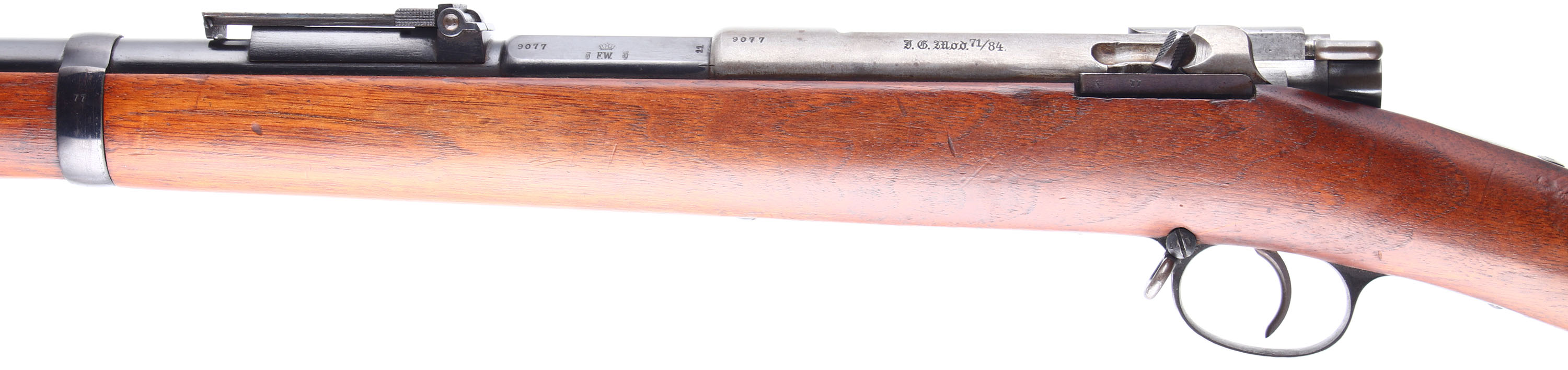 Spandau Arsenal, Model: I.G. 71/84 Mauser, Cal: 11x60mmR Mauser, MFG: 1888, S/N: 9077, Bolt action rifle, 31 1/2'' barrel. The straight wrist walnut stock is excellent with a few small nicks & dings from handling over time. One spot of oil staining next to the buttplate. Four Imperial German cartouches running from the bottom of wrist to the belly of the stock. The blued metal finish on the barrel rates 92% with a spot of cleaned roughness exposing gun metal gray on the top of the barrel between the front & middle barrel bands, & some light rust emanating from under the rear sight. The receiver was left in the white (unfinished) from the factory, & is starting to tone to a brown patina. Other metal parts retain the majority of the blue, but have some light scratches & brown patina spots. The left side of the receiver is marked with the S/N, & in German script ''I.G. MOD. 71/84.''. The right side of the receiver is marked with one Imperial German crown over letter proof & ''1888.''. The left side of the chamber flats is marked with the S/N, a small crown proof, a crown over ''F.W.'' proof, another small crown proof, & ''11''. The top of the chamber flats is marked with a crown over ''SPANDAU''. The right side of the chamber flats is marked with three Imperial German proofs. The buttplate is marked with a German proof on the upper extension, ''B'', ''E'', & last two digits of S/N. Other metal parts have small German proof stamps. All visible S/N marked parts are matching, including the screws. The bore is excellent. Its bright & mirrorlike with strong rifling. The barrel holds a barleycorn front sight, with a flip up ladder, V-notch rear sight marked 4 to 15. The stock carries a steel buttplate, left in the white, it is toning brown with spots of scratches/wear. The rifle has both bottom sling loops. A nice example of a Mauser 71/84. Antique, No FFL Req - Value: 700 to 1400