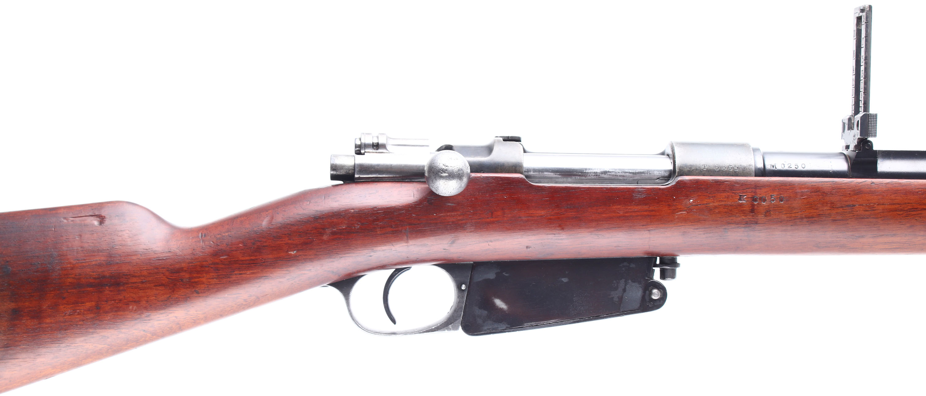 Deutsche Waffen-Und Munitionsfabriken (DWM), M1891 Argentino Mauser, Cal: 7.65x53mm Mauser, MFG: Late 1899, S/N: T 6665, Bolt action rifle, 29'' barrel. The straight wrist walnut stock is very good with minor nicks & dings from use/age. More small gouges ate the toe & light oil staining around the buttplate & rear sling base. A Mismatched S/N (K0050) is stamped into the right flat of the stock just in front of the magazine. Slightly worn acceptance roundel cartouches on right cheek of stock. There is one star over ''RA'' in a circle cartouche on the upper handguard, two more smaller cartouches on the bottom of the wrist, three ''AG'' in shield cartouches on the belly of the stock in front of the rear sling base, & another star over ''RA'' in a circle cartouche by the toe. The blued metal finish rates 90% on the barrel with spots of wear/thinning, & 25% on the receiver, mostly worn gun metal gray with blue in protected areas. The top of the receiver band has the faint remnants of the Argentine coat of arms. The left side of the receiver is marked with two proof stamps, ''MAUSER MODELO ARGENTINO 1891'', ''DEUTSCHE WAFFEN-UND'', ''MUNITIONSFABRIKEN.'', ''BERLIN''. The right side of the receiver band is stamped with the S/N. The barrel shank is marked with two proof stamps & the S/N ''M8250''. Other metal parts have small proofs. S/N mismatched bolt, barrel & magazine. The bolt has grind marks & is stiff when cycling, rifle should be looked at by a gunsmith before firing. The bore is excellent near MINT. Bright & mirrorlike with no visible wear. The barrel holds a barleycorn front sight with a flip-up ladder, V-notch rear sight marked 4 to 20. The stock carries a blued steel buttplate has wear, brown patina, & roughness/pitting scars under the finish. Rifle has both bottom sling loops. Rifle has no cleaning rod. Most Argentine Mauser have the crests ground off because it was a legal requirement to export them when the majority of them were imported. This requirement was gotten rid of later but since they imported the rifles in better condition first the ones in worse condition usually have them, & there are far fewer of them. With the problems with the bolt on this rifle it should be inspected by a gunsmith before firing, & is being SOLD AS IS with NO RETURNS ACCEPTED. FFL or C&R Req. - Value: 250 to 500