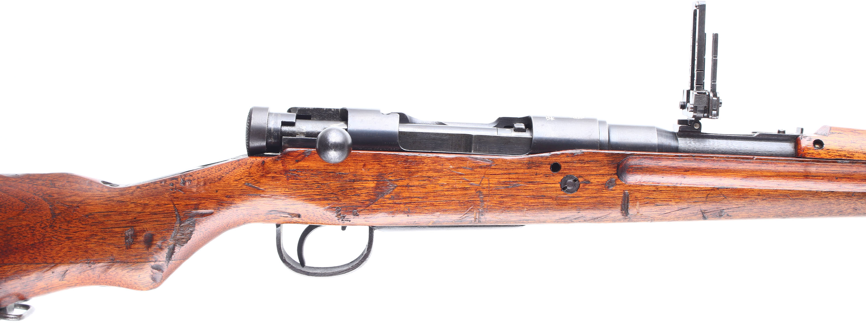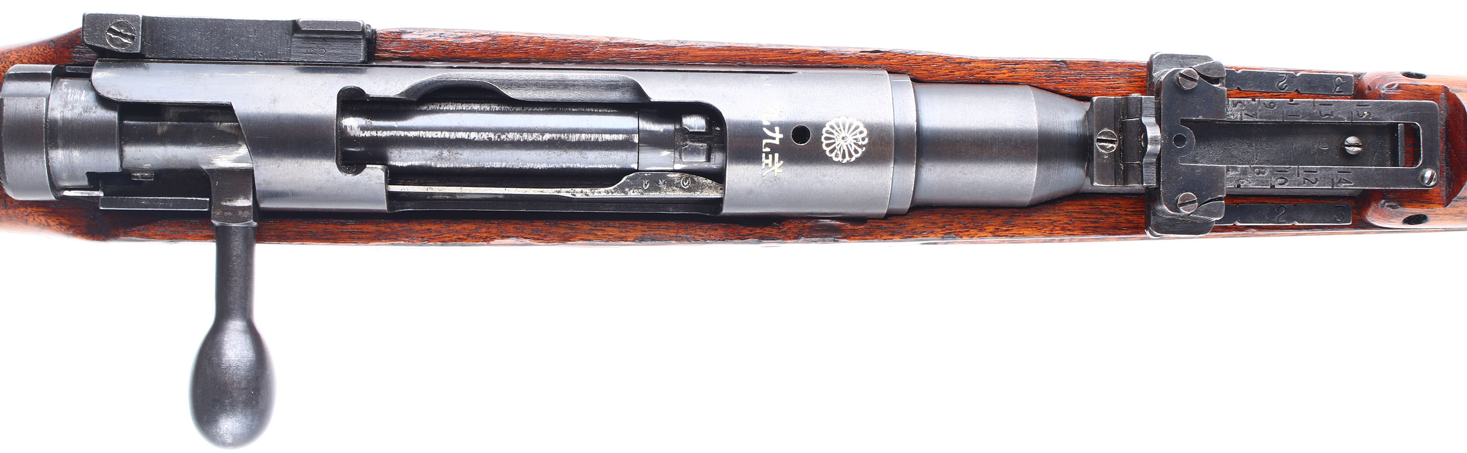 CONDITION: The semi-pistol grip wood stock is very good with various nicks, dings, dents, & scratches from use/age. A few deeper gouges on the pistol grip & buttstock. The two-piece buttstock is normal for Japanese rifles of this era, this was done to make the stocks stronger, easier to repair, & made better use of the wood to make the stock. The belly of the stock has a couple worn cartouches. The blued metal finish rate 94% overall with spots of light thinning, a few light scratches, a only a couple spots of brown patina speckling. The left side of the receiver is marked with the S/N the Nagoya Arsenal Logo, & a small inspector stamp. The receiver band is marked with a intact chrysanthemum, & ''TYPE 99'' in Japanese. S/N matching bolt. Root of bolt handle & extractor are S/N marked. S/N matching front barrel band. The bore is excellent. Its bright & mirrorlike with little to no visible wear. Chrome lined bore & bolt face (the type 99 was the first Military rifle to have a chrome lined bore). The barrel holds a barleycorn front sight without protective ears, & a flip up ladder aperture rear sight with the anti-aircraft sight wings, the ladder is marked 3 to 15, AA sight wings marked 1 to 3. The stock carries a metal cupped buttplate. Buttplate is toning brown with speckled rust. Rifle has both left side sling loops & the cleaning rod. Rifle appears to mechanically function fine. As stated, Nagoya only made 8,000 of these rifles at the beginning of the war, not leaving many left in this good of condition & with an intact Chrysanthemum. FFL or C&R Req - Value: 700 to 1500