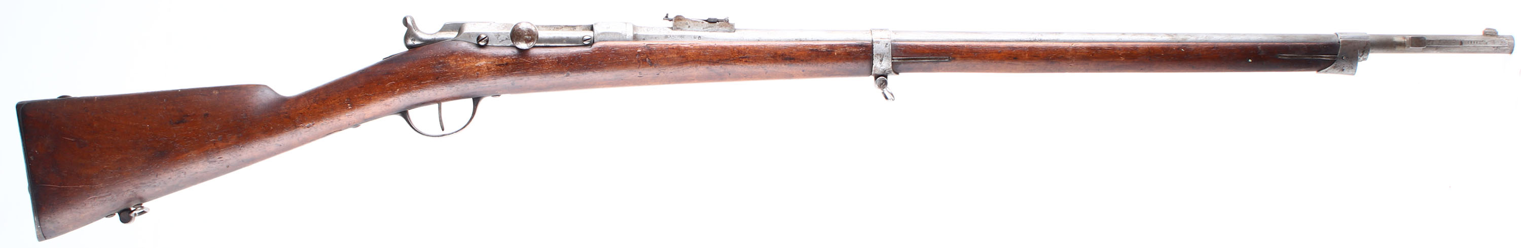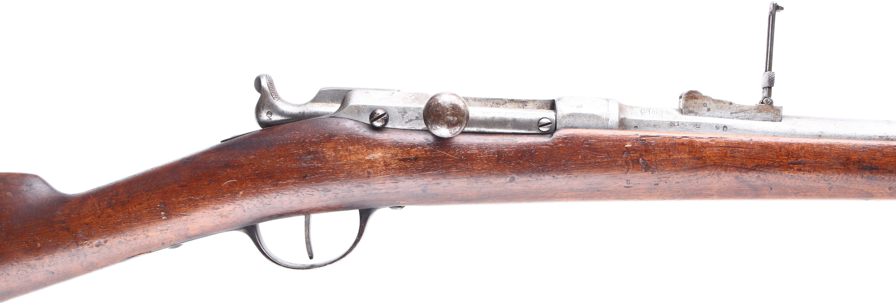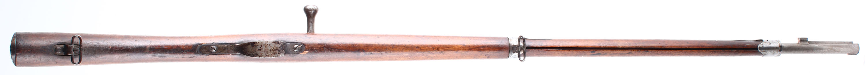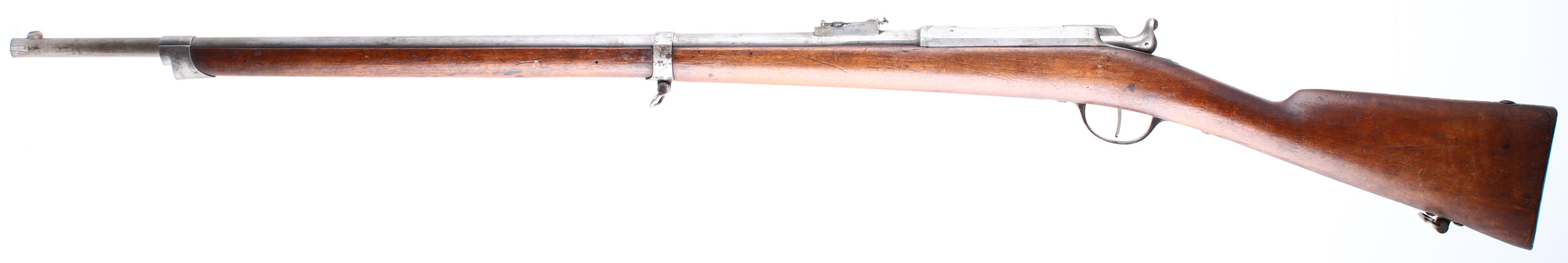 HISTORY: The Chassepot was the French answer to the Prussian Dreyse rifle that was causing devastating effects in Europe. Its famous for its use during the Franco-Prussian war of 1870-71, where even though the French lost, it proved it was a far better rifle than the Dreyse. After the war Prussia noted that it was far more accurate by not using a paper sabot around the bullet like Dreyse, & had greater range due to better gas sealing. The French would even extend the sights on the Chassepot in later models because of its great range & accuracy compared to other rifles of its time. The Chassepot is known as one of the better if not the best needle-fire rifle made. The French would convert the Chassepot to a metallic cartridge gun in 1874 with Colonel Basile Gras system, & create the Gras rifle, which would go on to be used by the French clear until WW1. The French originally thought about making the Chassepot a metallic cartridge gun from the start. But with the complications of early cartridges, & logistic issues they decided on a paper cartridge. The manufacturer & model number on the left side of the receiver has been scrubbed off there is some mentions of this being done by the Germans to some rifles that were captured during the Franco-Prussian war but nothing concrete. Usually they would be marked with German unit markings or be modified to take a German bayonet. Lots of the captured rifles would be converted to the 11mm Mauser cartridge & turned into carbines for the Prussian cavalry.