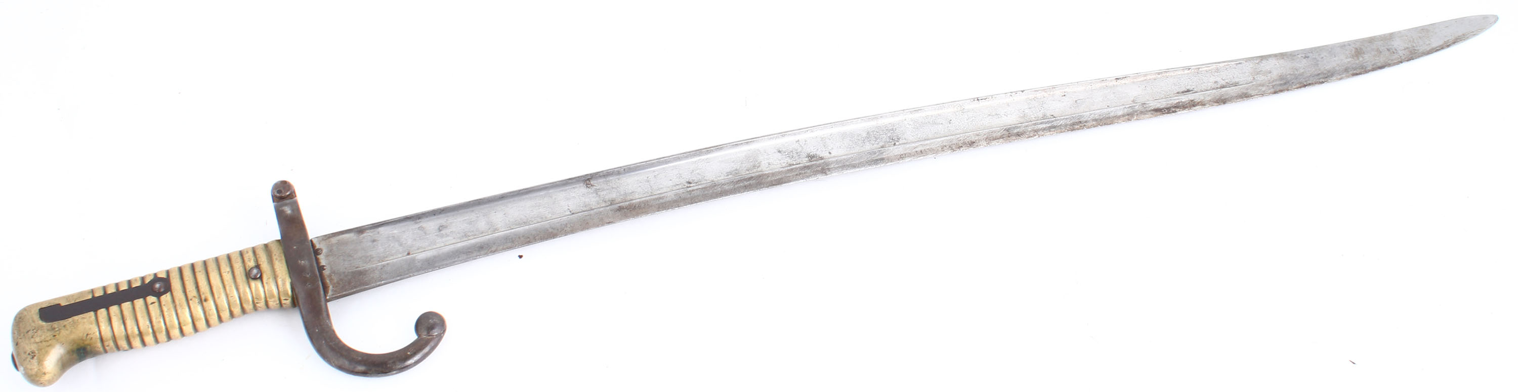 CONDITION: The straight wrist walnut stock is good with various nicks, dings, dents, chips, & scratches from use/age. The right cheek of the stock does not have the usually roundel acceptance cartouche with a box wood plug in the middle, indicating that the stock was replaced after French service. The metal has worn to a gunmetal gray with brown patina speckling. The receiver band is marked with a small proof mark on each side & what appears to be a French script ''de''. The right rear section of the receiver has a ''2''. The left rear side of the barrel is marked with the S/N, ''D'', ''F'' in circle, & ''L'' in circle. The right rear of the barrel is marked ''C.1867'', ''MI'', small ''C'' under crown in a oval proof, star over ''E'', & three more small proofs. The ''C.1867'' means the barrel was made at Chatellerault in 1867. The ''MI'' means ''Manufacture Imperiale'', this was marked on all guns before & during the Franco-Prussian war for Napoleon the Thirds Rain. The Guns made after Frances defeat in the war are marked ''MA'' which means ''Manufacture D Armes'' when they switched to a Republic. The back of the buttplate has worn/faded markings from rust, they appear to read ''99'', ''36'', ''95''. Right side of rear barrel band is marked ''V 22''. S/N mismatched bolt (R11172) all bolt parts match each other. S/N matching bayonet lug. The rubber obturator is dry & hardened, unknown condition of the needle. The bore is very good. Its bright with strong rifling, but has spots of roughness. The barrel holds a small barleycorn front sight with a stepped base/ladder wide V-notch rear sight, does not have the updated added on ladder. Marked 2 to 4 on the base, 5 to 12 on the ladder. The stock carries a steel buttplate that's toning to a brown patina. The rifle has both sling loops & is missing the cleaning/clearing rod. The rifle comes with the correct Yatagan Sword bayonet, has a brass handle, light rust/patina on the blade, edge has chips, S/N mismatched to the rifle. Antique, No FFL Req - Value: 700 to 1400
